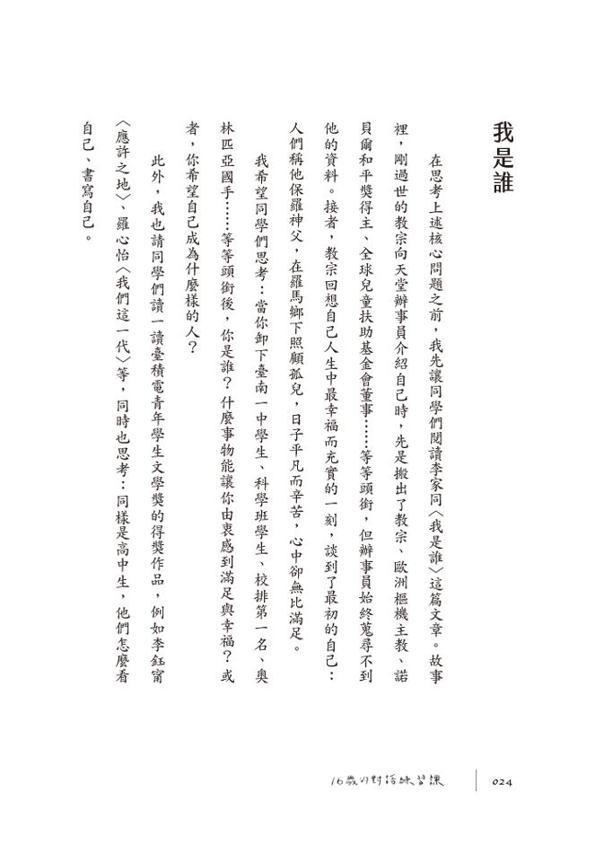 在思考上述核心問題之前,我先讓同學們閱讀李家同〈我是誰〉這篇文章。故事裡,剛過世的教宗向天堂辦事員介紹自己時,先是搬出了教宗、歐洲樞機主教、諾貝爾和平獎得主、全球兒童扶助基金會董事……等等頭銜,但辦事員始終蒐尋不到他的資料。接者,教宗回想自己人生中最幸福而充實的一刻,談到了最初的自己:人們稱他保羅神父,在羅馬鄉下照顧孤兒,日子平凡而辛苦,心中卻無比滿足。