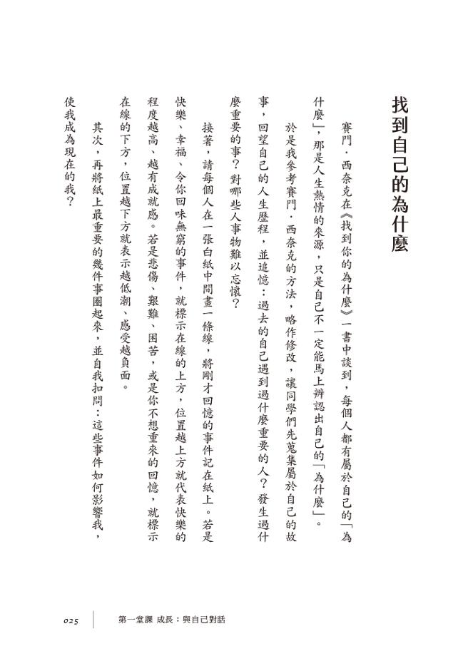 於是我參考賽門.西奈克的方法,略作修改,讓同學們先蒐集屬於自己的故事,回望自己的人生歷程,並追憶:過去的自己遇到過什麼重要的人?發生過什麼重要的事?對哪些人事物難以忘懷?