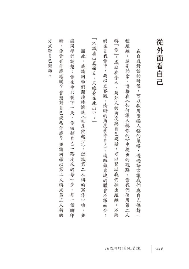 在自我對話的時候,可以採用變換人稱的策略,透過語言讓我們與自己保持一種距離。這是約拿.博格在《如何讓人聽你的》中提出的觀點。當我們使用第二人稱「你」,或站在旁人、局外人的角度與自己說話,可以幫助我們拉出距離,不陷溺在自我當中,而以更客觀、清晰的角度看待自己。這跟蘇東坡的體會不謀而合:「不識盧山真面目,只緣身在此山中。」