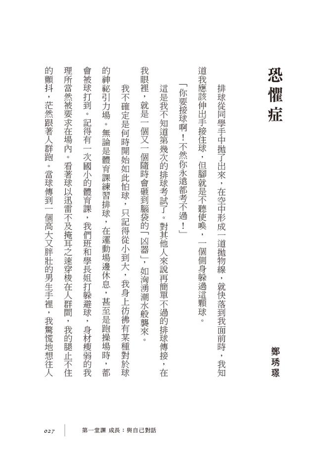 此後,踏上運動場的我就像一隻受驚的小白兔,害怕天外飛來一顆「殺人凶器」,害怕同學訕笑的目光,害怕體育老師劈頭蓋臉的謾罵。即便現在已升上高中,這種恐懼彷彿已深深刻在骨子裡,排斥如籃球、排球等有一定大小且會在空中「亂竄」的球類,導致我悲慘的體育成績,成為大家眼中的書呆子。