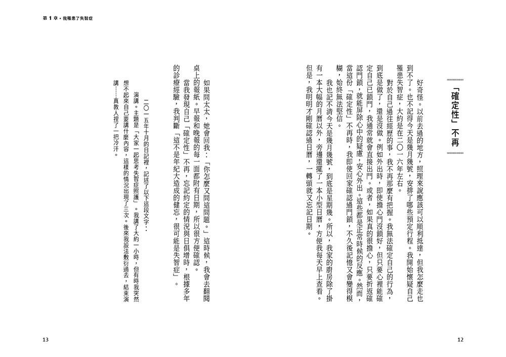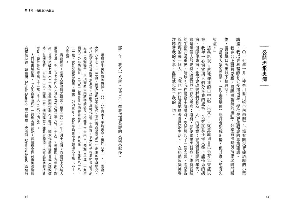 我是一名專科醫師,治療過上百名、甚至上千名病患,也是參與日本政府將「痴呆」正名為「認知症」(失智症的日文)的討論委員會成員。我撰寫本書的目的是希望告訴大家,實際罹患失智症以後,我心中所思、所感,以及身為「當事人」,我從中得到的領悟。同時,我也希望留下記錄,分享自己大半人生都在面對失智症的生活方式,以及這段期間我所歷經的日本失智症歷史。