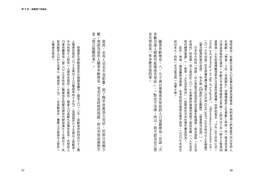 根據日本厚生勞動省(類似台灣衛福部和勞動部的綜合機關)預估,在二〇二五年所有二戰後嬰兒潮世代都屆滿七十五歲以上時,約有七百萬人可能罹患失智症,即高齡者每五人就有一人。罹患失智症絕非什麼特殊情況,雖然有些人到了晚年依舊活力充沛,但這些人衰老可以說只是時間早晚的問題。我之所以決定公開病症,是希望傳達一個觀念:失智症是每個人都可能面臨的問題,我們不需要過分害怕。