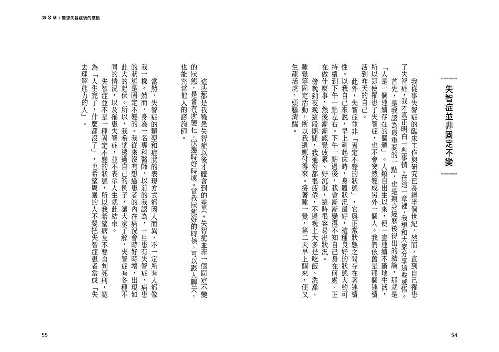 在那之後又過了兩年,我也察覺自己的症狀變得相當嚴重。然而,人自出生以來,便是連續不斷地活著,所以即使罹患了失智症,我自認為有些地方並沒有像旁人所想的發生很大的變化。實際上,即使罹患失智症,也不會讓人突然變成另外一個人,我們依舊是那個一直活到昨天的自我的延續。