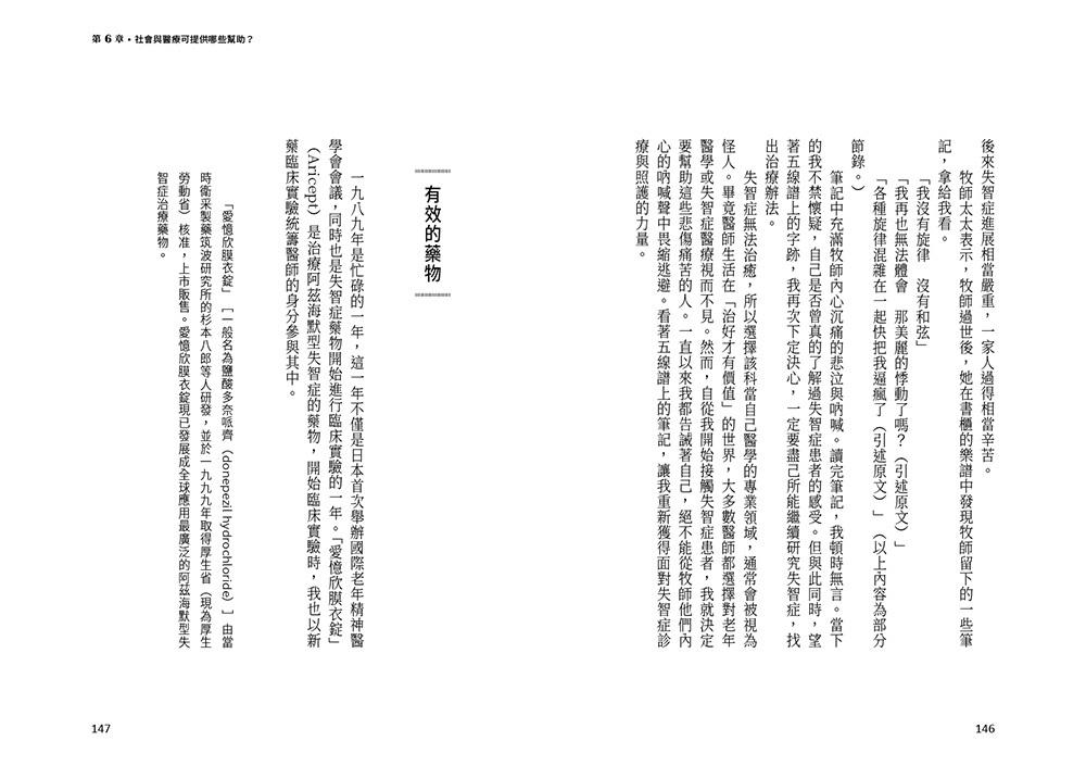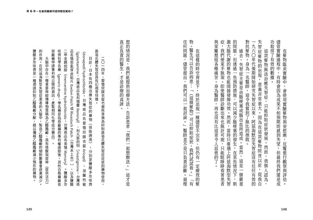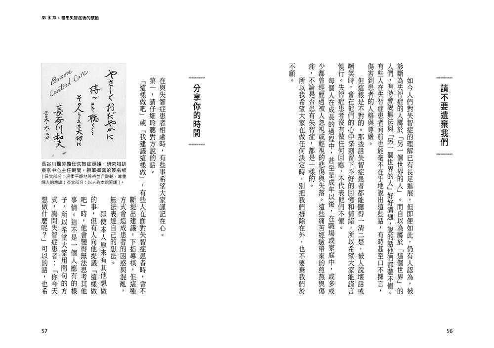 書中除了珍貴的「第一人稱」自述,為了讓所有讀者更了解失智症,長谷川醫師從「什麼是失智症」、診斷流程、危險因子、預防重點開始說明,進而解說「長谷川式失智症量表」的制訂祕辛、量表的問題項目與評分方式、日本失智症醫療的發展歷史,以及社會醫療措施等,從各個角度全方位詳說,有助於大家更認識失智症。
