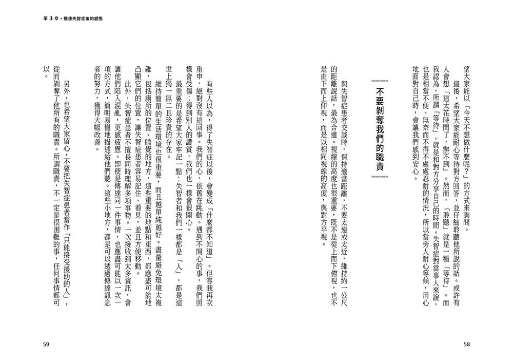 此外,失智症常被認為是一種可怕的疾病,但它的本質是「生活上的障礙」,主要特徵是失去了以往可以輕鬆做到的「普通生活」。這種變化,既不方便又很麻煩,家人也會不知所措。然而,周遭人的應對方式,可以大幅減輕這些障礙的嚴重程度。我由衷希望大家可以理解。