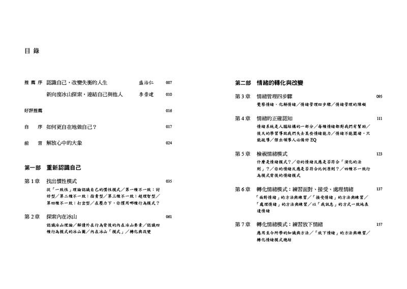 第二部以五章的篇幅說明,「情緒」這個內在冰山要素如何影響我們的外在行為,以及如何經由認識自己的情緒模式、改變自己的情緒模式,以跳脫自己的慣性之方法。讀者也可將之視為做好情緒管理、提升EQ 的方法論。