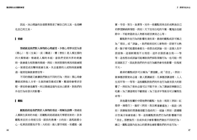 第三部則分別說明「觀點」、「渴望」、「期待」這三個內在冰山要素如何影響我們的外在行為,並提供經由改變自己的觀點模式、渴望模式、期待模式,以跳脫自己的慣性之方法。