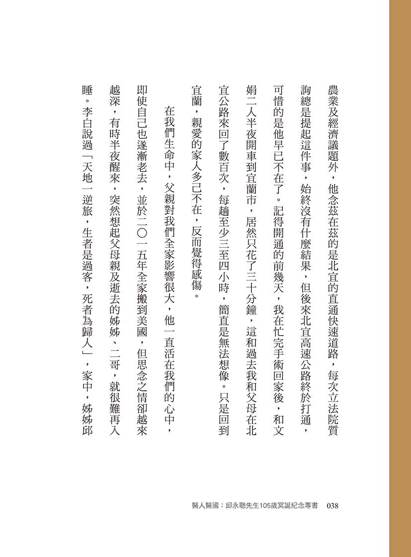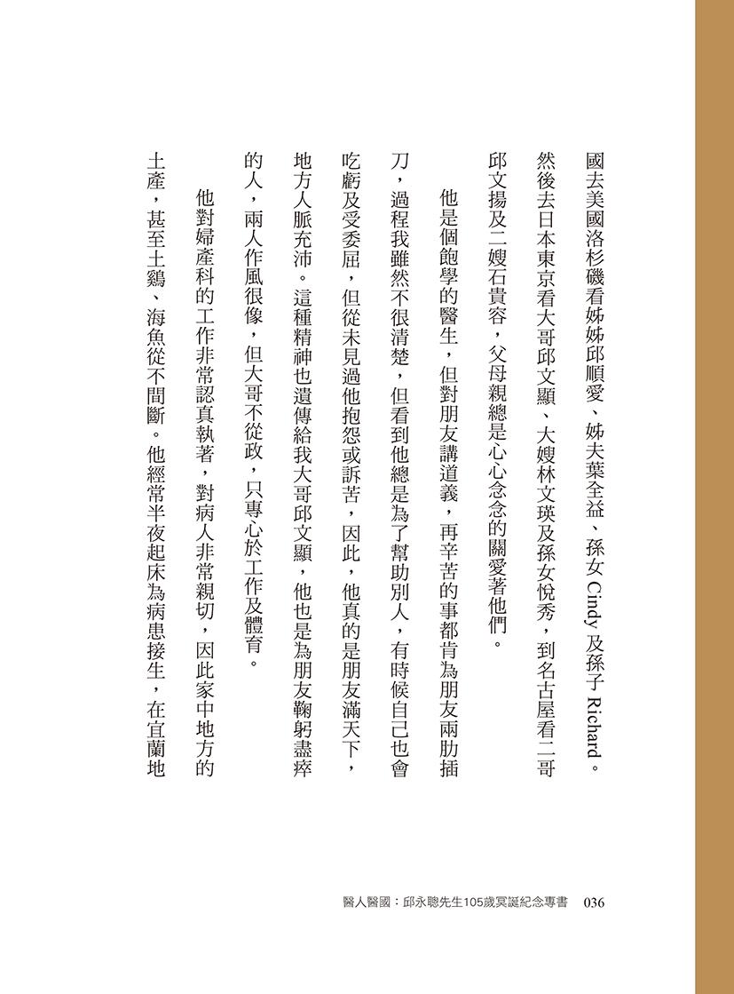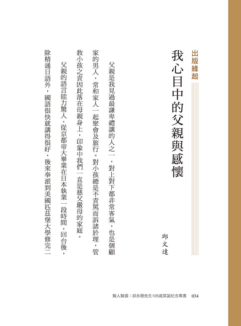 在家父一○五歲冥誕紀念之際出版《醫人醫國 : 邱永聰先生105歲冥誕紀念專書》,作為家族世代傳承與後代子孫永遠的懷念。