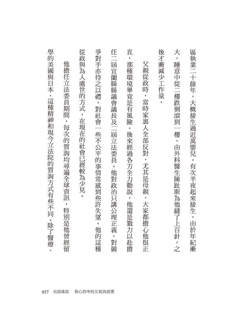 父親從政時,當時家裹人全部反對,尤其是母親,大家都擔心他很正直,那種環境畢竟是有風險。後來經過各方全力勸說,他還是戮力以赴擔任二屆宜蘭縣縣議會議長及二屆立法委員。他對政治只講公理正義,對競爭對手亦待之以禮,對社會一些不公平的事情感到些許失望,他的這種從政與為人處世的方式,在現在的社會已經較為少見。