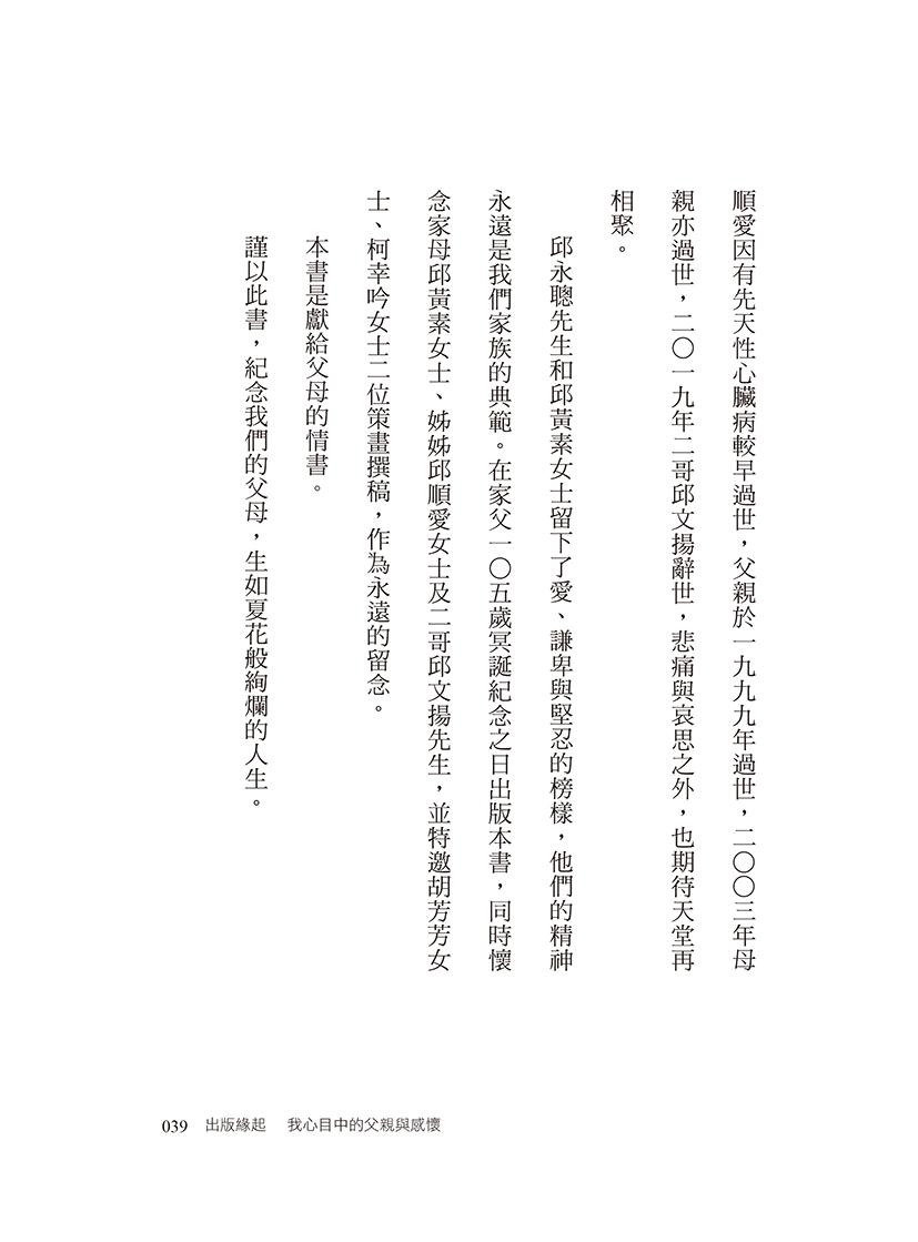 ◆謹以此書,紀念我們的父母:邱永聰先生和邱黃素女士,生如夏花般絢爛的人生