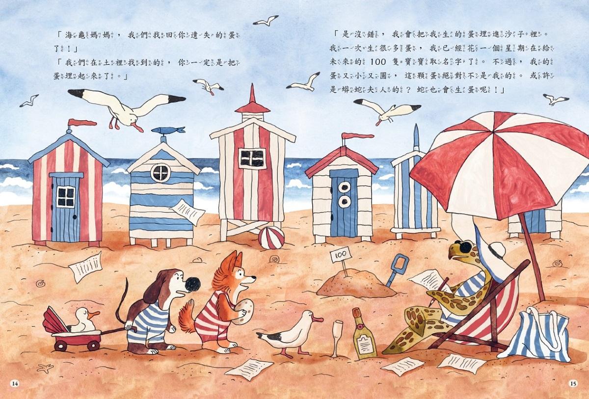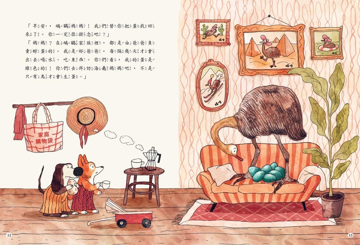 「媽媽?在鴯鶓家族裡,都是由爸爸負責孵蛋的。我是好爸爸,每隔幾天才會出去喝水、吃東西。你們看,我的蛋是綠色的!你們去拜訪海龜媽媽吧,不是只有鳥才會生蛋。」