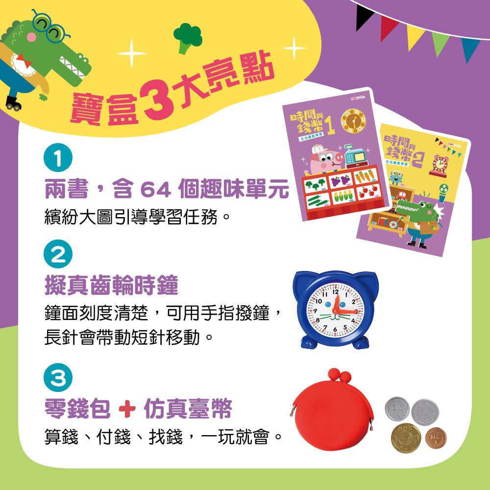 本學習寶盒擁有最貼近生活的豐富題型,隨著精心設計的任務引導,搭配操作實際教具,有效輔助家長輕鬆帶領幼兒認識時間與錢幣,讓孩子的量感必修課充滿歡樂笑聲!