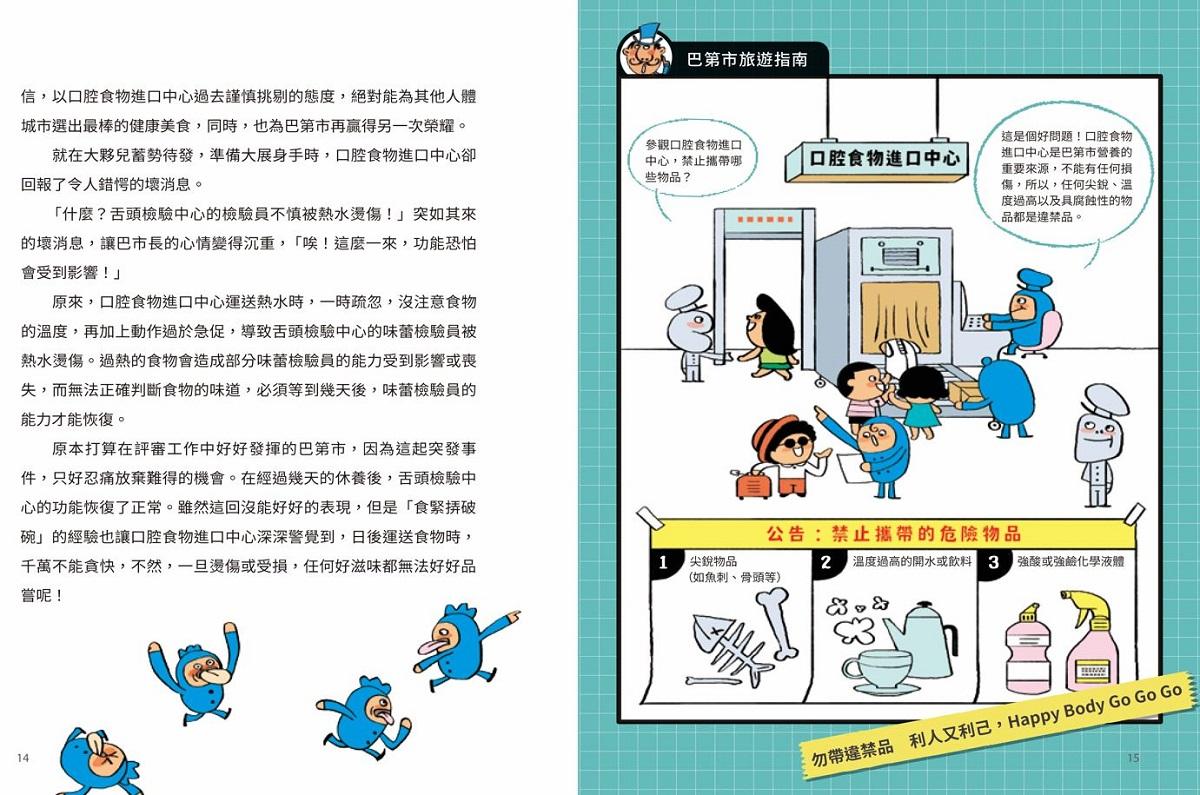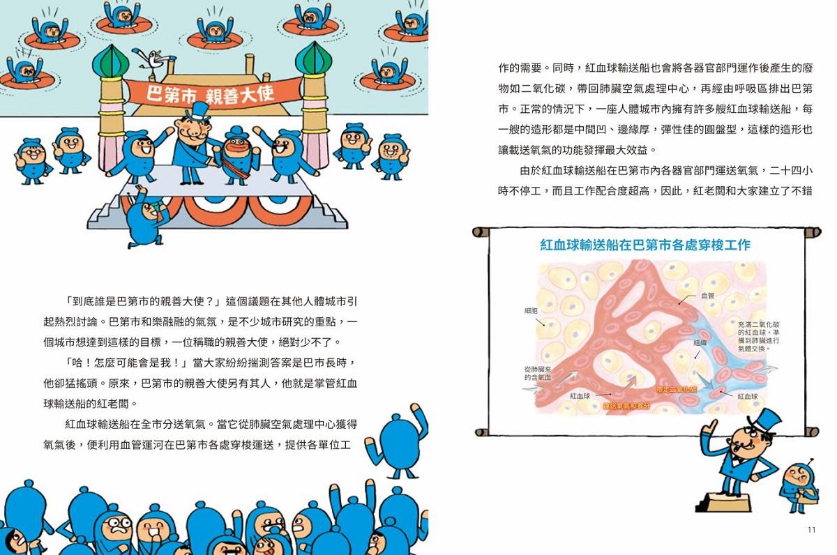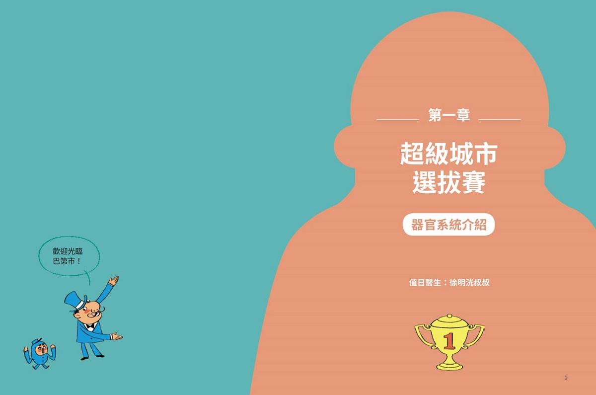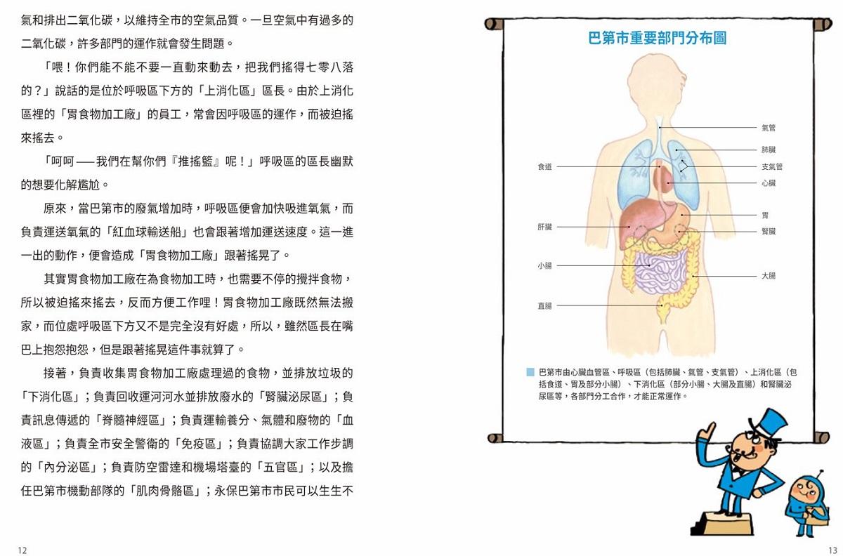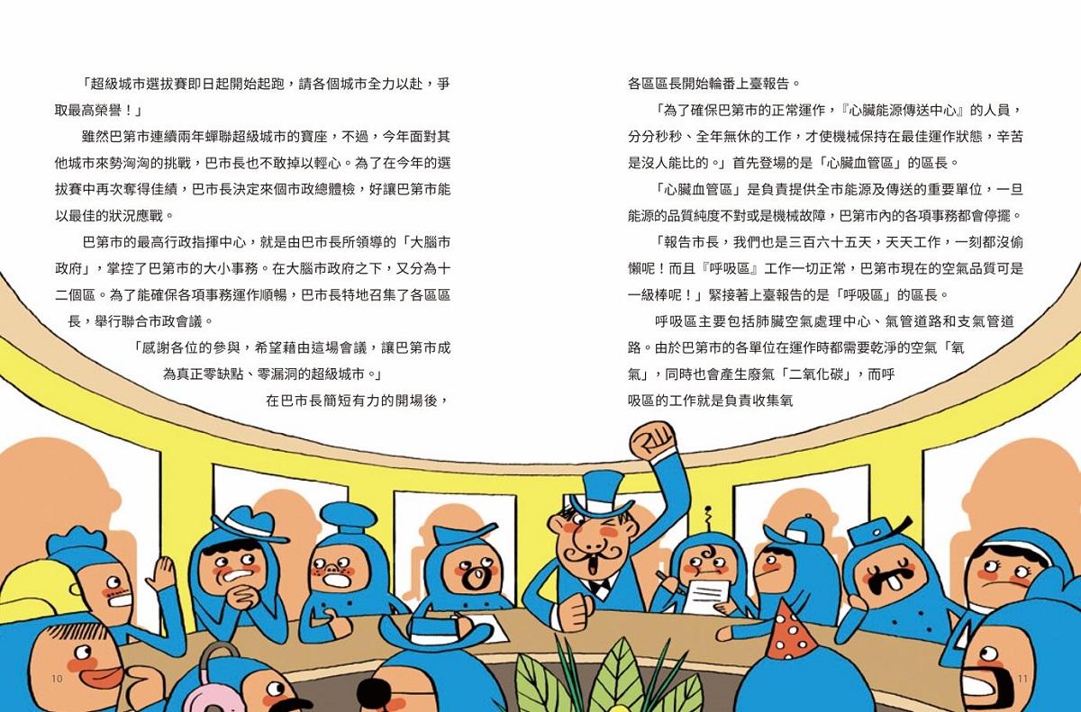 「巴第市」(body 諧音) 如同臺北市共分12 個行政區,由巴市長領著大腦市政府與心臟血管區、呼吸區、上消化區等……12 區的行政團隊,積極營造出一個「健康.活力」的城市。