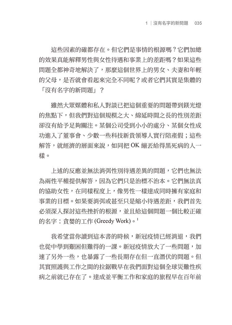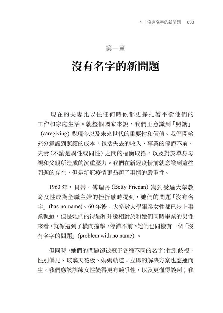 這些因素的確都存在。但它們是事情的根源嗎?它們加總的效果真能解釋男性與女性待遇和事業上的差距嗎?如果這些問題全都神奇地解決了,那麼這個世界上的男女、夫妻和年輕的父母,是否就會看起來完全不同呢?或者它們其實是集體的「沒有名字的新問題」?