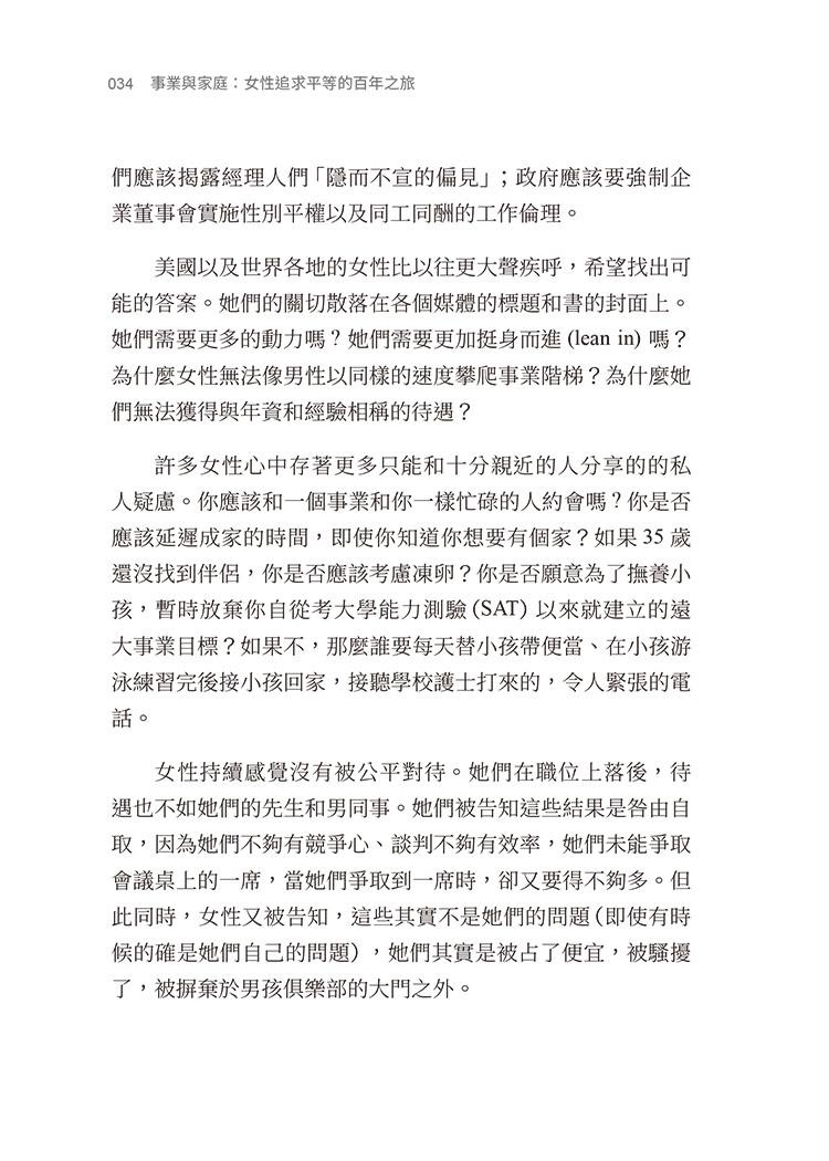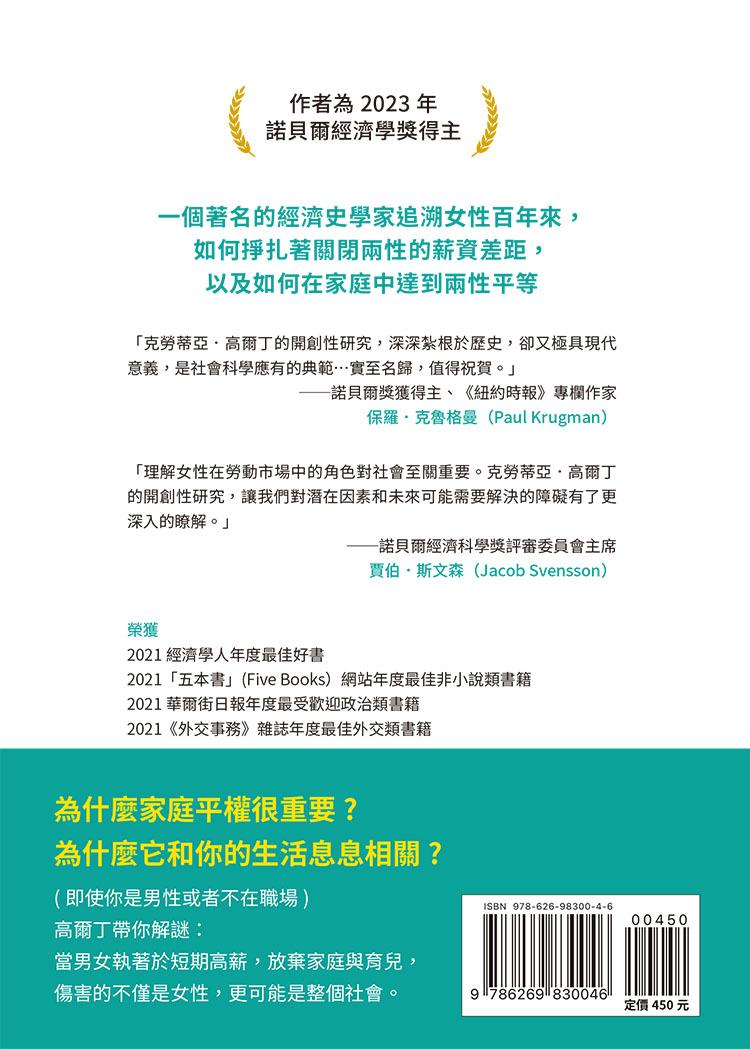一世紀前,大家普遍相信,大學畢業女性只能在事業和家庭中選擇一項。今天,雖然大學畢業女性的人數已超過男性,但是對於女性來說,想要同時擁有事業和家庭仍充滿了各項挑戰。克勞蒂亞.高爾丁追溯了二十世紀性別平等發展以及相關的各項重大社會變革,以及女性如何在變革的道路上努力兼顧事業與家庭。她也揭露了何以真正的平等對於想要同時擁有事業和家庭的夫妻來說仍舊遙不可及。反歧視法和更開放的工作環境雖然縮小了性別和薪資的差距,卻不足以徹底解決這個問題。《事業與家庭》這本書解釋何以我們必須在工作結構上做出根本的改變,並且正視照護的價值,才能真正達到性別以及夫妻平等的目標。