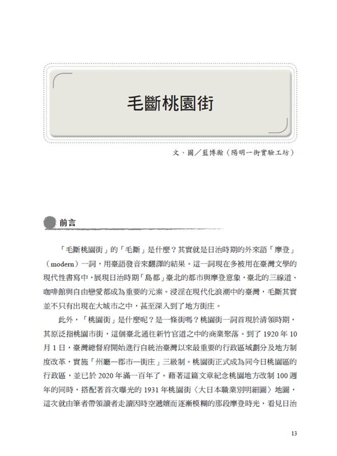 本書緣起於2020年9月5日的一場辦在中央大學歷史所的工作坊,活動名稱為「走讀桃園路線書寫工作坊」,主要邀請桃園在地的高中教師及地方文史工作者針對桃園走獨路線進行設計。當時共有十三篇口頭報告,計有:〈百年風華桃園埤圳〉(林煒舒)、〈毛斷桃園街〉(藍博瀚)、〈走讀桃園神社〉(黃郁惠、趙文義)、〈踏查中路〉(陳榮聲、許聖迪)、〈記憶八塊厝〉(邱述文)、〈龜山,光陰的故事〉(蘇健倫)、〈走讀澗仔壢〉(陳俊有)、〈走讀中壢五號倉庫周邊地景〉(劉醇遠)、〈走讀雙連坡〉(陳美燕)、〈記憶崁津風華〉(倪郁嵐、楊杜煜)、〈桃園多元族群走讀路線〉(朱嘉慧)、〈航空城遷徙地區的歷史人文與地理〉(鄭巧君)、〈跟著曾茂公巡守三七圳〉(謝名恒)。當天的報名人數相當多,約有一百位朋友參與,大家對於桃園的走讀路線都相當感興趣,特別是108課綱那時剛上路不久,有探究實作課程,許多高中老師對於如何將地方學融入課程頗感焦慮,因此想透過這活動進一步了解。會後,我持續與這些報告者聯繫,看看能否將口頭報告轉為文章,好讓有更多感興趣的朋友能夠有個讀本,因此有了後續的書寫。經過一年多的努力,我們終於收到十篇文稿,文章的內容大致是以行政區劃分,但也不全然是,像是霄裡區域,就涵蓋有八德及大溪地區。其餘行政區還有桃園、中壢、楊梅、新屋、龜山及復興區,美中不足的是,我們還欠大園、觀音、蘆竹、龍潭及平鎮,希望日後有機會的話,可以補足沒處理到的地區。