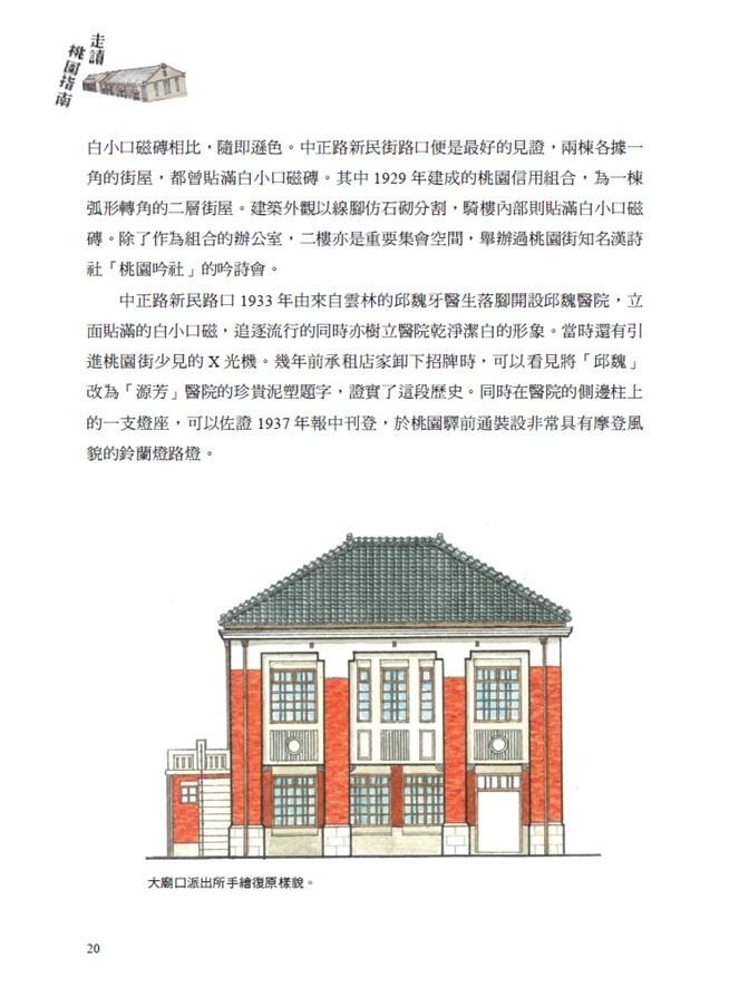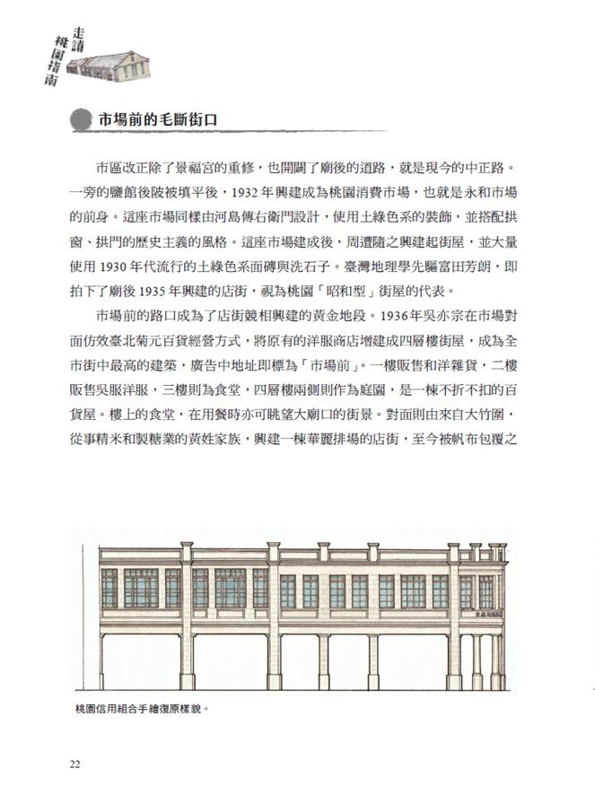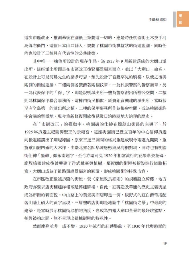 1923 年市區改正即是以景福宮為中心的商業市街為目標,將清領時期狹窄蜿蜒的道路拓寬拉直成棋盤狀的路網,也因此道路兩側的街屋必須拆除退縮,甚至1813 年建成的景福宮亦被拆遷退縮,形成現在熟悉的大廟口圓環。這次市區改正,推測幕後在圖紙上策劃這一切的,應是時任桃園街土木技手河島傳右衛門,這位日本山口縣人,規劃了桃園市街祺盤狀的街道藍圖,同時任內也設計了三棟具有代表性的公共建築。