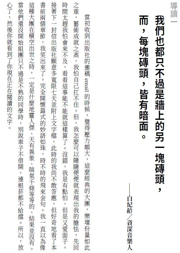 當初收到出版社的邀稿email的時候,覺得壓力頗大,這麼經典的大團,樂壇份量如此之重,藝術成就之高,我怕自己扛不住。但,我怎麼可以隨隨便便就表現出我的膽怯,先回時間太趕我怕會來不及,看看這事能不能就這樣算了。沒錯,我是有點怕,但是又愛面子。接著下一封信出版社願意多寬限七天並附上文字檔,此時的我尚不敢答應,但好奇地看了本書前兩個章節,我笑出來了。完全開懷篇式的妙語如珠,時不時的飛來金句。我一直以為像這種大團在橫空出世之時,一定是什麼地靈人傑、天有異象、瑞氣千條等等的,結果並沒有。當他們還沒開始組團只不過是不熟的同學時,別說車子不借開,連根菸都不給擋。所以,放心了,然後你就看到了你現在正在閱讀的文字。