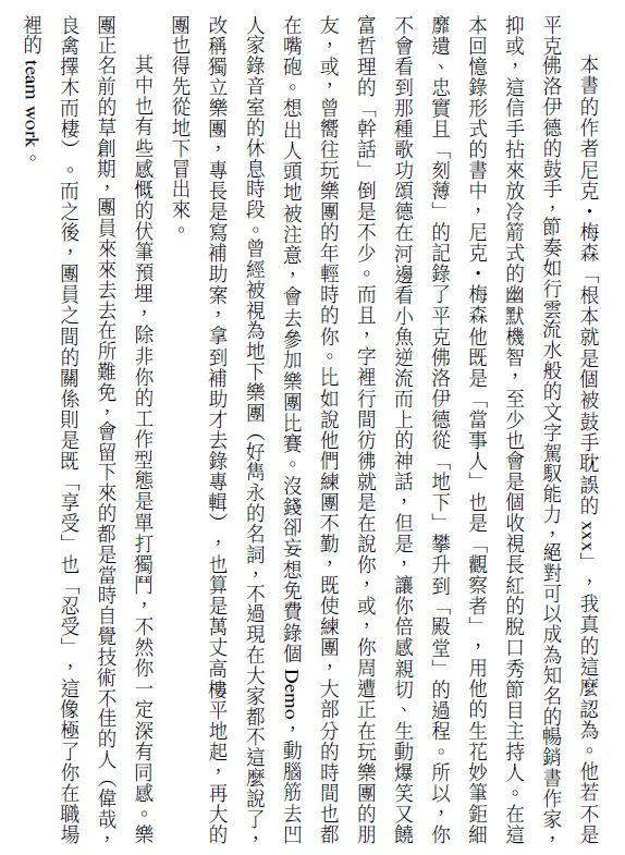 總之,這本回憶錄,從頭到尾都精采,順暢到底絕無冷場,連文末的「後記」的後勁都極強。因為作者尼克・梅森是平克佛洛伊德自1965年成團以來唯一不離不棄的元老,由他執筆的正當性無庸置疑,但其他還「健在」的團員總得讓人家過目一下以示尊重。作者表示:「羅傑・華特斯 (貝斯手)早已為這本書做出獨特貢獻,傳記即將問世前,羅傑讀完手稿,他們約在倫敦一間飯店碰面,聽聽羅傑的想法。他不辭辛苦的校對錯誤,並詢問我的一些闡述和重點(what’s the point?)。這些觀察用綠筆註記,當他翻閱紙本,我偶爾驚見這綠筆大範圍揮灑的段落;羅傑只草寫了『胡說八道』橫越所有文字。」