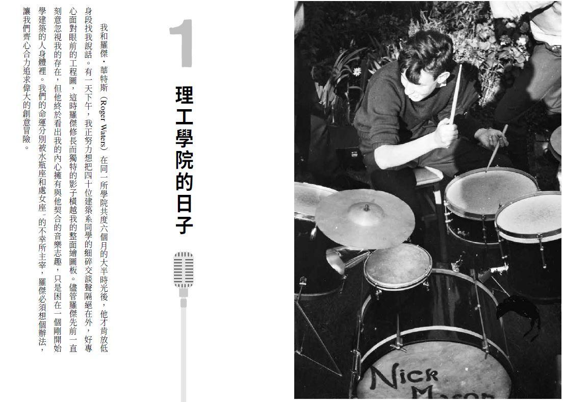 打開盤式留聲機,五零年代的青少年真的不能沒有一張貓王,再過十年,孩子們崇拜的男團不是滾石,就是披頭四,燈芯絨夾克和切爾西靴成為衣櫥必備。此時的平克佛洛伊德正值成團前夕,尼克・梅森和羅傑・華特斯是建築系同學,因為同樣醉心音樂,常翹課穿梭在樂器行、午後場電影院和 live 俱樂部之間。是奶油樂團跟吉米・罕醉克斯的現場讓尼克・梅森第一次下定決心走上音樂這條路,那晚他對著台上閃閃發亮的 Marshall ⾳箱和 Ludwig ⿎組流口水,更感受到一股所向披靡的力量,領悟不必要有帥哥主唱、華麗衣裝或是黃金歌曲結構,照樣可以做到震懾人心。後來到美國巡演時,平克佛洛伊德再次與「巫毒小孩」有了美麗的交集,當時名氣未開的他們被擺了一道,眼看著表演就要開天窗,竟接到吉米・罕醉克斯的神救援,要他們去他的「電子淑女」錄⾳室拿⾃⼰需要的器材。尼克・梅森書中少有的頌揚其中一次就出現在這裡:「有些⼈是真正的搖滾英雄。」