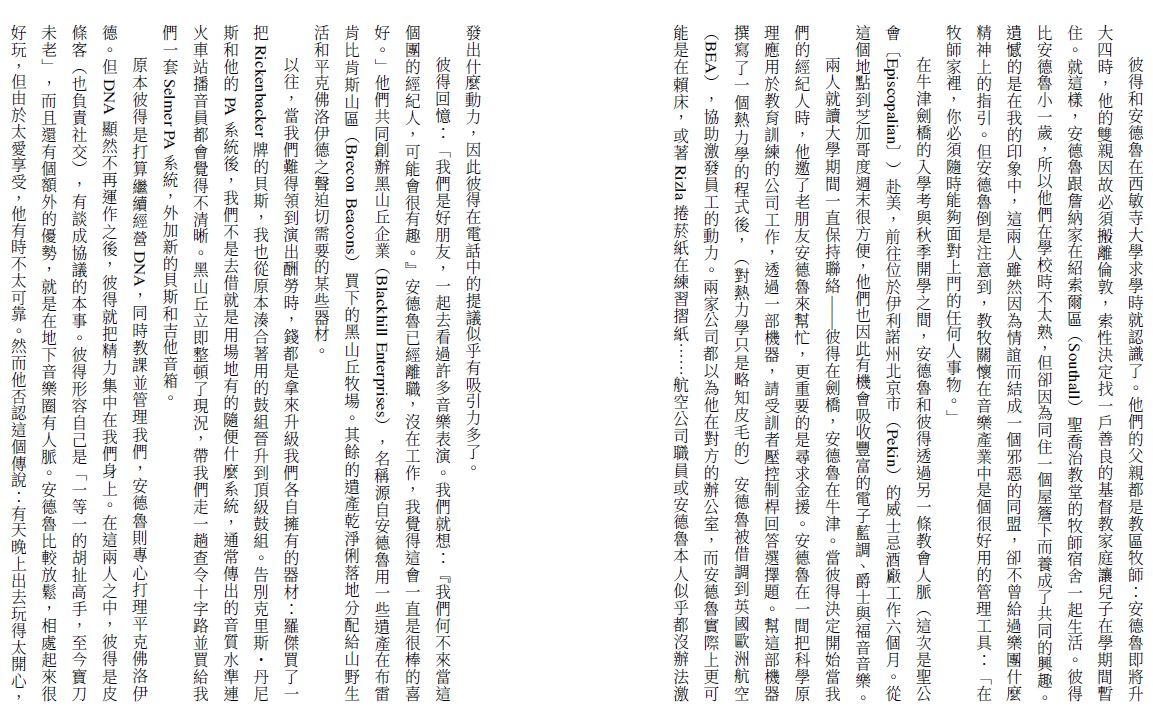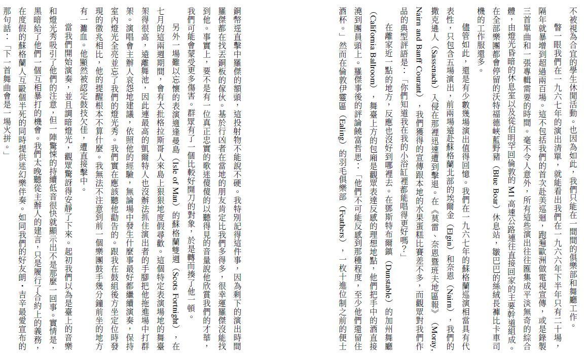 還有,還有,「大衛・吉爾摩(吉他手)顯然常和羅傑・華特斯逛同一間文具行,因為他的評論也用綠筆標示,並且對校稿同樣細心。我特別感謝大衛的意見,因為我知道他一向對任何團員企圖寫樂團史『心存疑慮』,因為我們沒有一個人,在每逢本團史上決定性或創作的那一刻,全員到齊。」