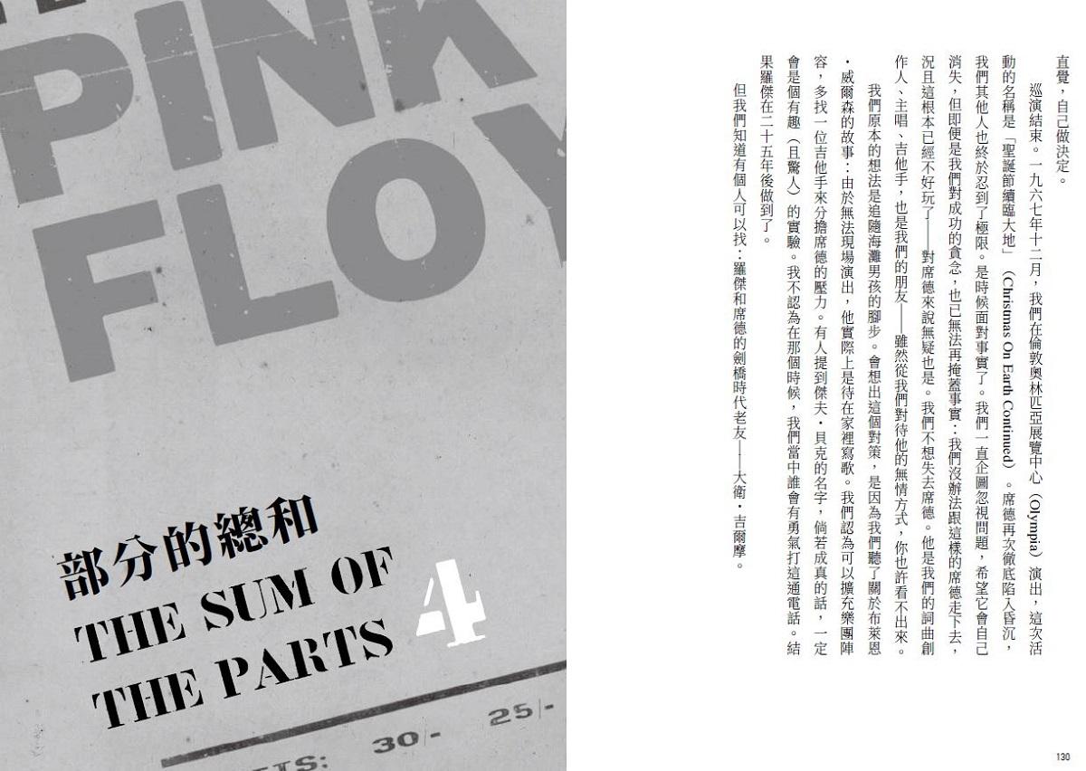 書中還不時閃現平克佛洛伊德的樂手祕笈,像是多年後重演〈回聲〉,大衛・吉爾摩分析他們之所以無法重現原曲氛圍,部分原因是合作的年輕樂⼿沒辦法捨棄技巧,不像七〇年代初的他們那樣隨意撥弄樂器。這個說法呼應理察・萊特的⾳樂哲學:「技巧比起想法次要得多。」而尼克・梅森也說過:「每段即興都代表啟動⼀次創作流程,我們⼀向認為那是樂團最難跨越的⾨檻,要容許⾃⼰把腦中所想彈奏出來,不忌諱也不設限。」精進演奏和克服心魔,其實是一體兩面。
