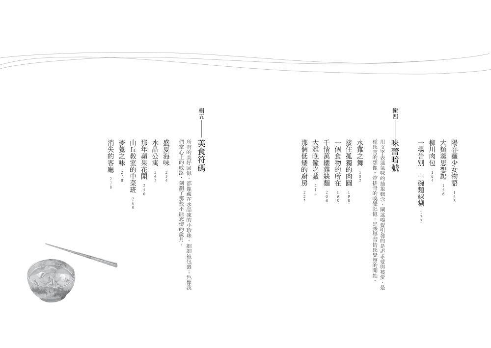 本書有三十種食物,隱藏在故事中。無論是料理或小吃,它們在我書頁中出現,必有當時的香澤,也必有當時的使命,叫我日後一一召喚如幽靈,吐露彼時的迷惘與隱晦。