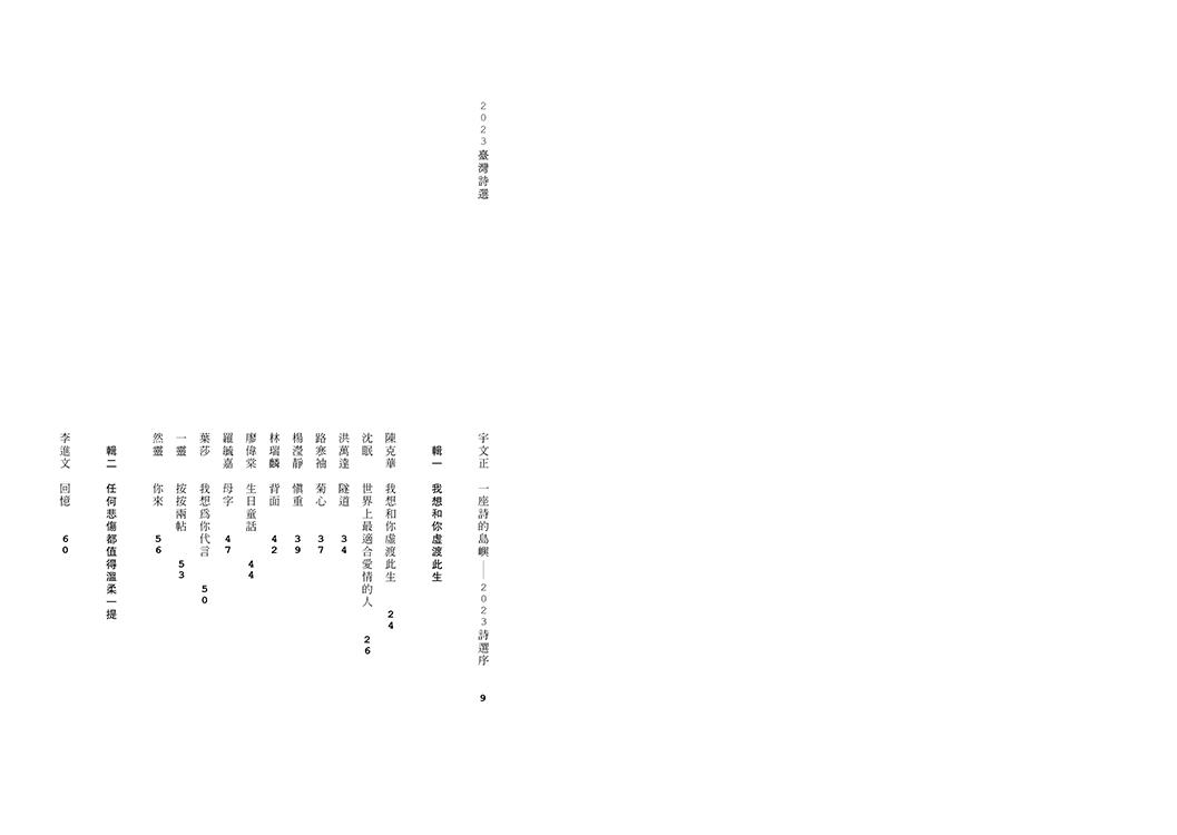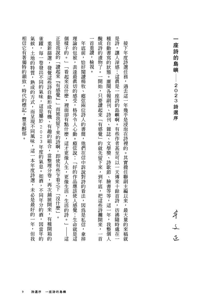 2023是戰爭之年,俄烏戰爭持續中,10月7日爆發以巴衝突,台海情勢詭譎,人心惟危,我讀到大量回應時局的詩作,也曾考慮把這些作品放在首卷,凸顯時代的聲音。思慮再三,仍然決定先回到生命的日常裡來。一部年度詩選,應該折射這一整年所有的生活,詩人的所感、所思,以及向記憶尋索、向未來預言、盼望的所有軌跡。