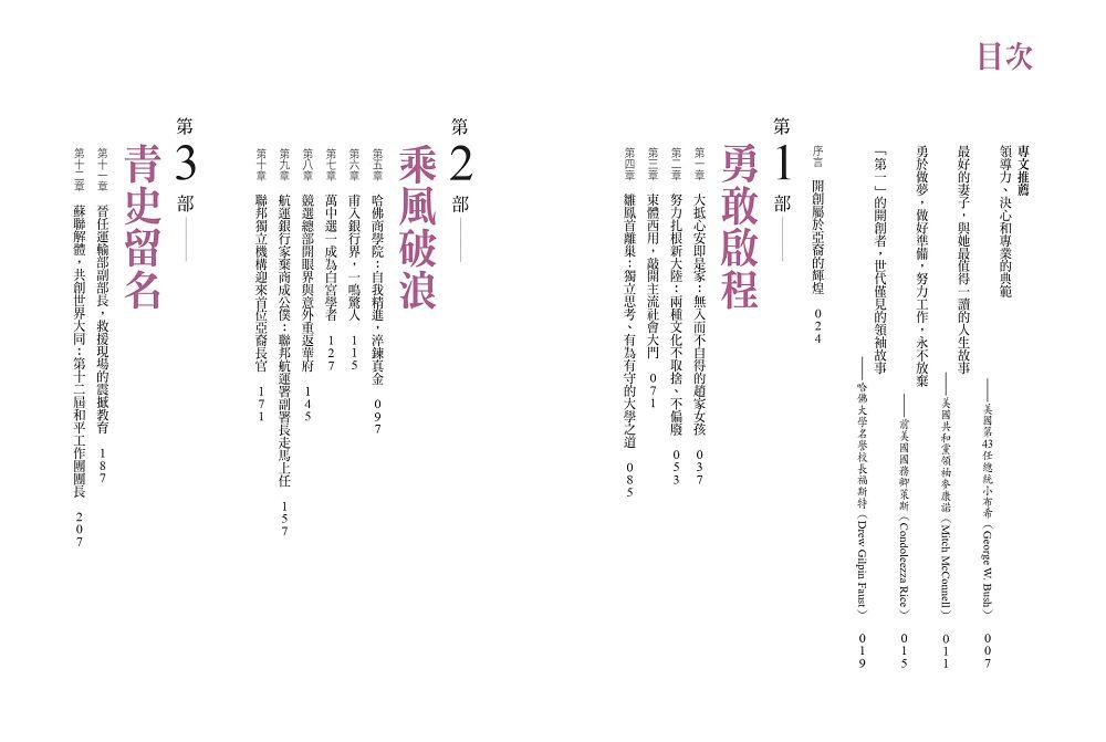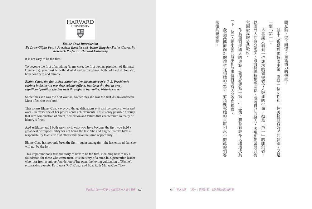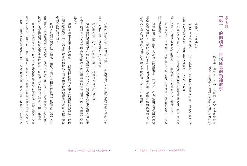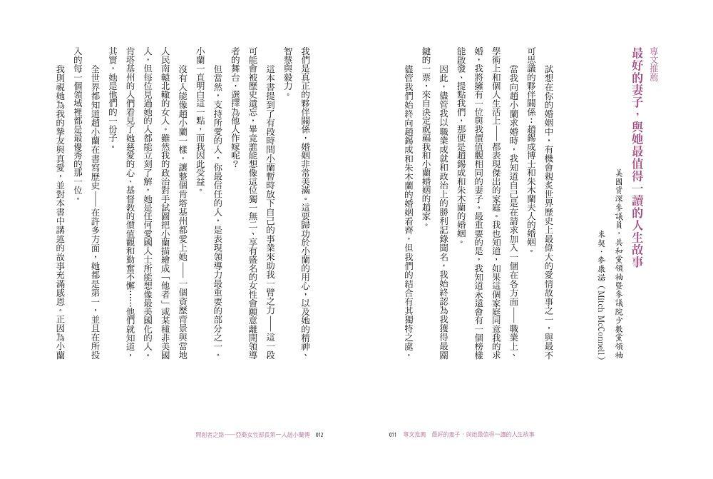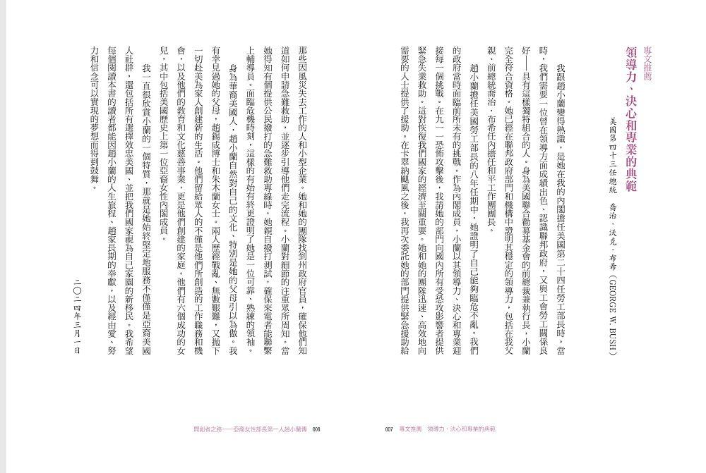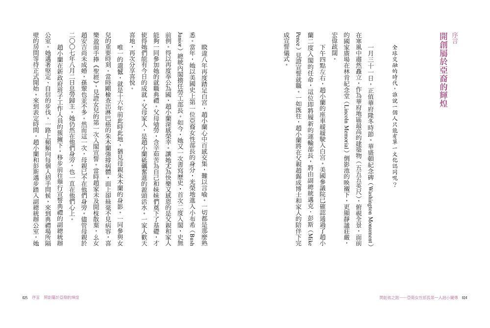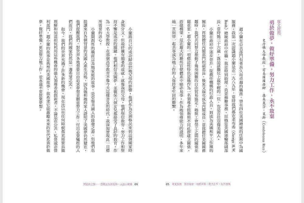 趙小蘭,一個在台灣出生、來到美國時一句英文也不會的移民小女孩,是如何一步一步,在史書上寫下濃墨重彩的一頁——成為美國建國以來首位接受任命為總統內閣成員的亞裔女性?作為先驅者、開創者,趙小蘭打破了數不清的障礙,有形或無形的天花板,闖出了一條前無古人的路,為亞裔美國人,甚至可說是全體美國人,打開了無窮的機會之窗。畢生致力於公共服務的趙小蘭,以孜孜勤勉、日日不怠的努力,以勇闖無人境、敢換新天地的魄力,實質提升了亞裔美國人在美國主流社會、乃至全球社會的認可與地位。