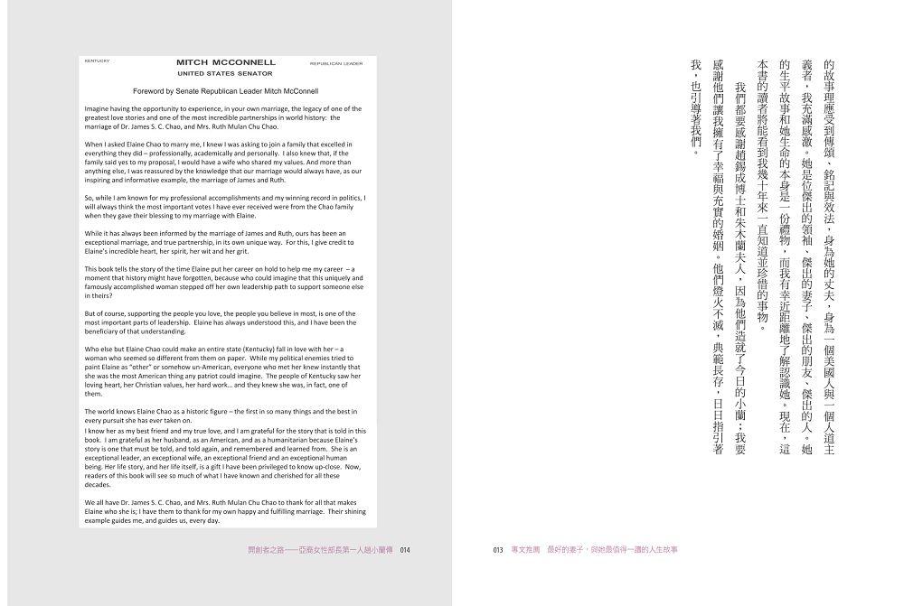 美國共和黨領袖暨參議院少數黨領袖 麥康諾(Mitch McConnell):「她是位傑出的領袖、傑出的妻子、傑出的朋友、傑出的人。她的生平故事和她生命的本身是一份禮物,而我有幸近距離地了解認識她。現在,這本書的讀者將能看到我幾十年來一直知道並珍惜的事物。」