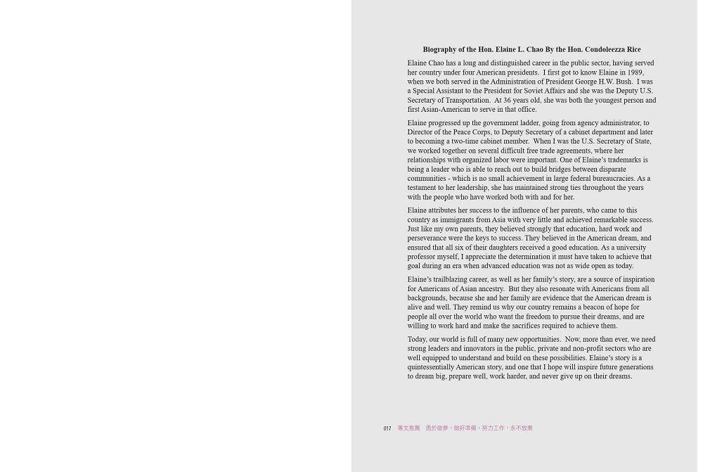一本精采的個人奮鬥史,並收錄百餘張精采照片,一窺亞裔的驕傲:趙小蘭部長人生中的重要歷史時刻。