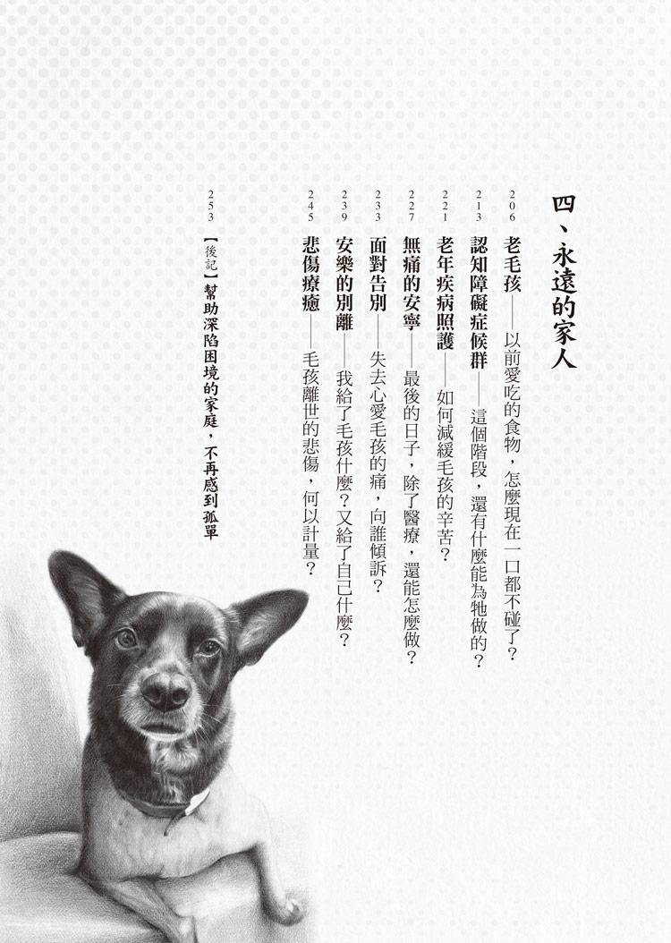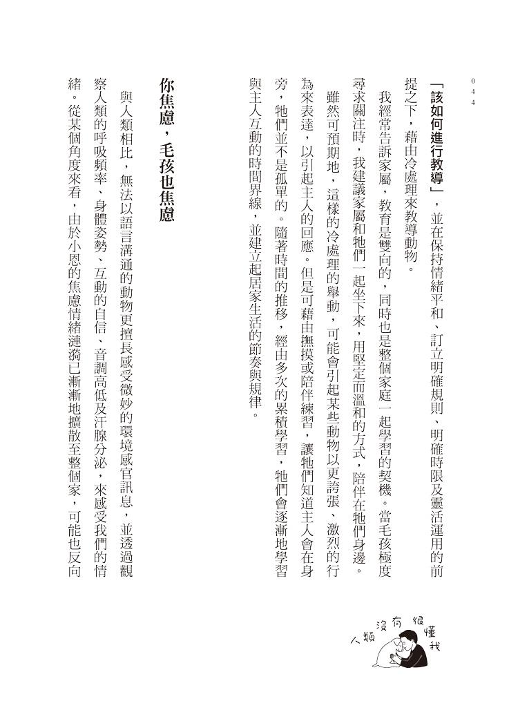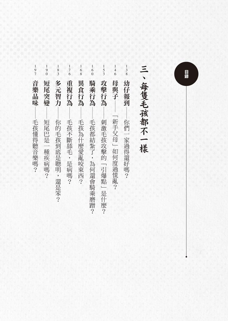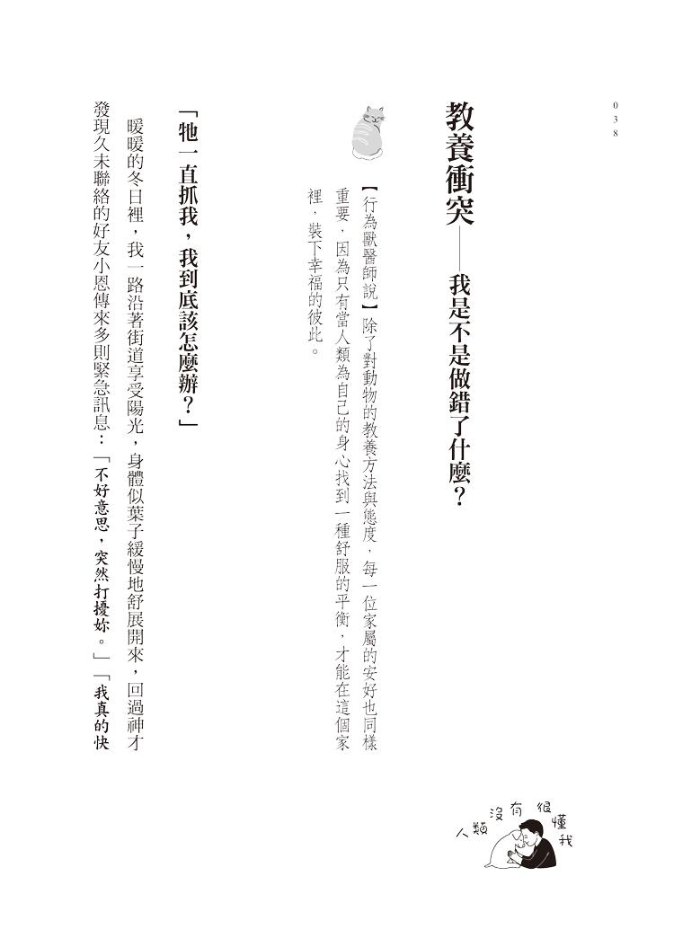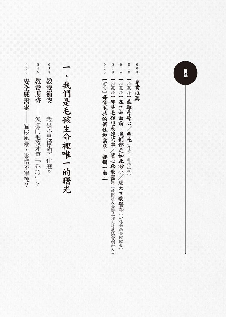 在本書中,我不僅分享許多關於犬、貓的行為知識,也寫下許多親身看診經歷,希望讓讀者能夠體會,在每個困境中的家屬與毛孩,也都同時擁有自己生活的模樣。