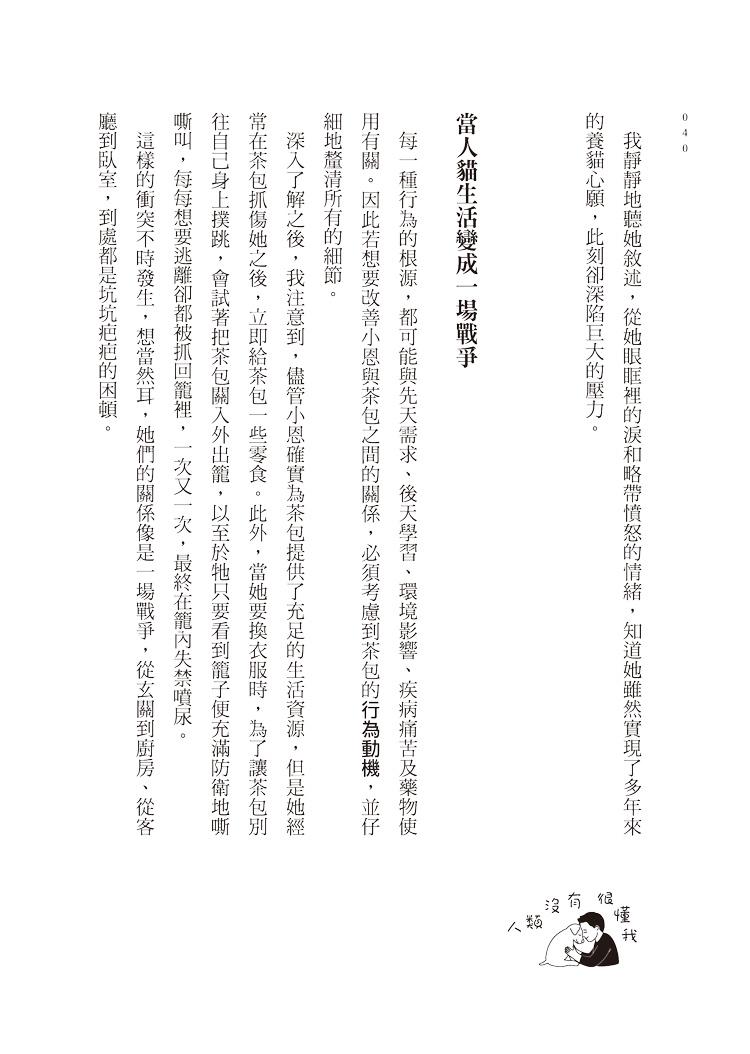 三年多後的一日,當李醫師又遞來一個錦囊,我一面雙手收下,一面覺得自己再無法藏著這些「對付貓的手段」;原來許多難解的題,只要稍微轉個彎,用牠們的眼光看世界,事情就有了餘地。這實在有必要讓更多照顧者知道!職業病令我向她坦白自己的報社編輯工作,請教她能否寫幾篇關於動物行為學的文章?她以一貫的真誠注視我,卻並沒有馬上接話。