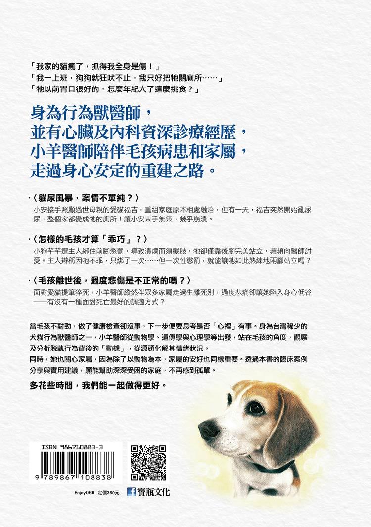「我家的貓瘋了,抓得我全身是傷!」「我一上班,狗狗就狂吠不止,我只好把牠關廁所……」「牠以前胃口很好的,怎麼年紀大了這麼挑食?」……當毛孩不對勁,做了健康檢查卻沒事,下一步便要思考是否「心裡」有事。身為台灣稀少的犬貓行為獸醫師之一,小羊醫師從動物學、遺傳學與心理學等出發,站在毛孩的角度,觀察及分析脫軌行為背後的「動機」,從源頭化解其情緒狀況。
