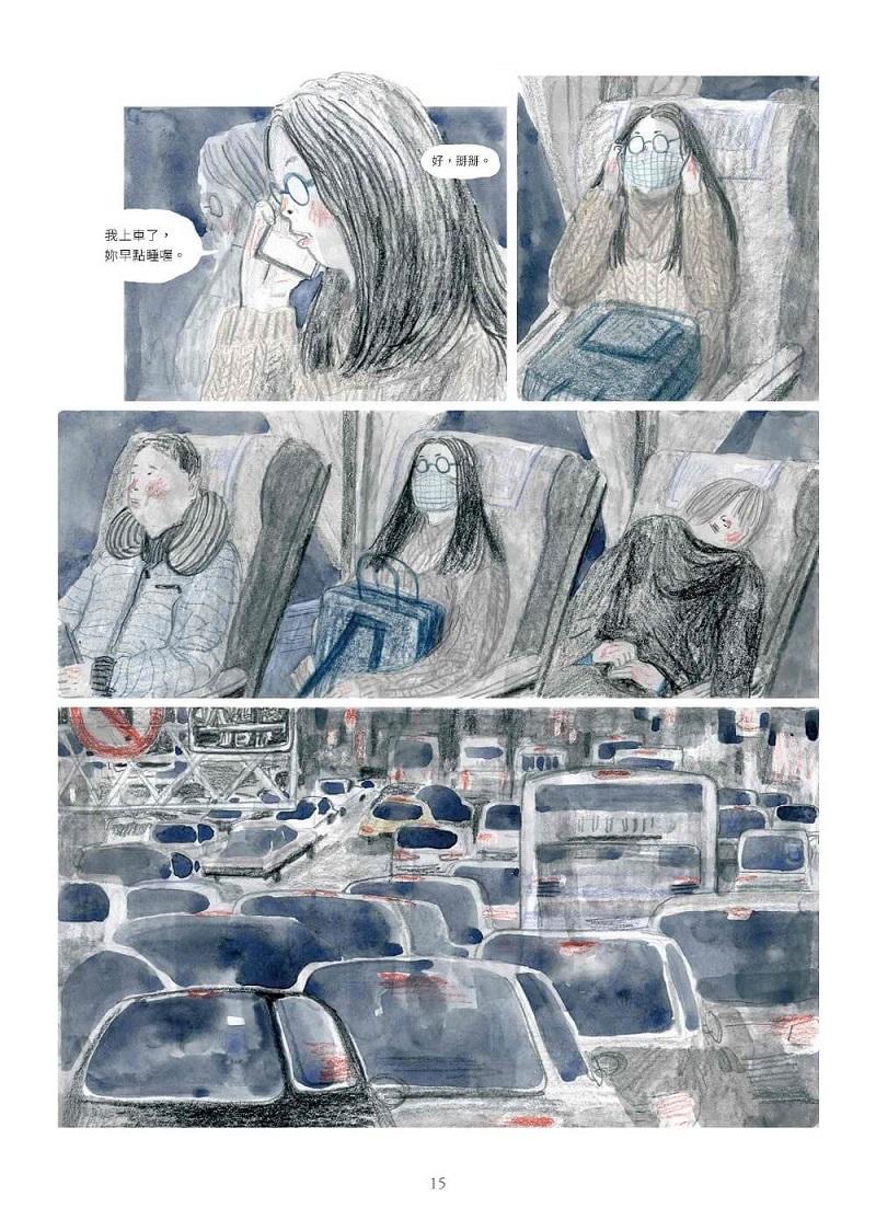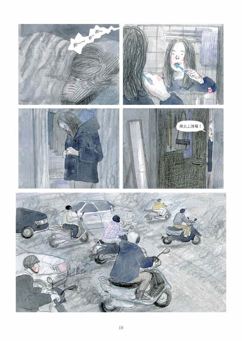 沛珛的畫作具有某種張力,如果要說的話,我認為她將傳統的刺點延伸,拓展為邊界,與光暈。到底怎麼做到的?雖然畫的是大都市中的各種小插曲,但她的故事往往也能打動畢業後即遠離台北的我。那些寂寞和錯身的遺憾,如何能精準打中?初讀《暫時先這樣》時,我以為那是一種青春的迴響,重讀新版後我發現,沛珛比她自己能想像的更具野心,她挑戰的不僅是圖文藝術,而是聲音、空間,文學邊陲之外的可能。先談談聲音,沛珛擅長場景轉換,分鏡利用不同的視角,可以編織出清晰的鐵門聲、機車發動聲、切菜聲。畫面雖然對話很稀少,但是聲音卻很豐富,將都會生活的體感處理得非常貼合――從未寧靜,永遠有著背景聲響,所以紙本的閱讀經驗得以貼近劇場或者影集。