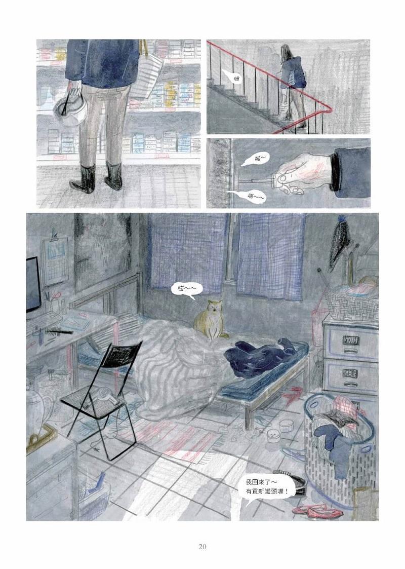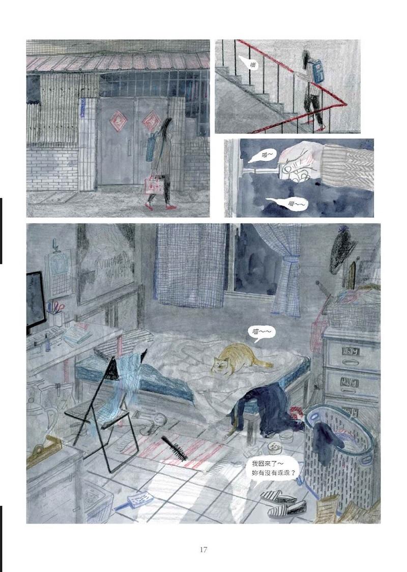 沛珛表示,這篇純粹想畫南機場國宅空間的〈Tracing the Cat〉,四張圖的極短篇,完成當下覺得生澀鬆散,後來回頭看,反而是那些鬆散的結構和造型讓畫面輕盈不沉悶。然後開始進行本書後,一直翻出這篇來看,想再畫出這種鬆卻一直失敗,也許是同時要經營敘事多了一項要忙,手鬆不了。作為家裡蹲的接案工作者,一時無取材方向,便以自己和旁人的生活作為田野去挖掘或偷菜。一開始就決定要畫短篇集,一來可以挑各種事件獨立成一篇不受限制,二來是怕搞砸。一個故事,再怎麼樣搞砸也就是這個短篇內結束。十頁一篇也是個沒什麼道理的設定,一段情節本可以依需求增減篇幅,但固定的頁數像是自己設的一個遊戲規則,不同的內容我都得把它們精簡或拉拔到這個頁數。像這樣的短篇,有動力的話完全可以跟著人生經驗的發展無限增生,不過也可以都寫在筆記本裡就好……本想從容優雅地完成第一本漫畫,但最後還是按照慣例壓著死線交貨。這激發了挽回顏面的心情,下一本一定在時間規劃、畫面、故事上,都會更好……雖然自己都懷疑是否會有下一本。