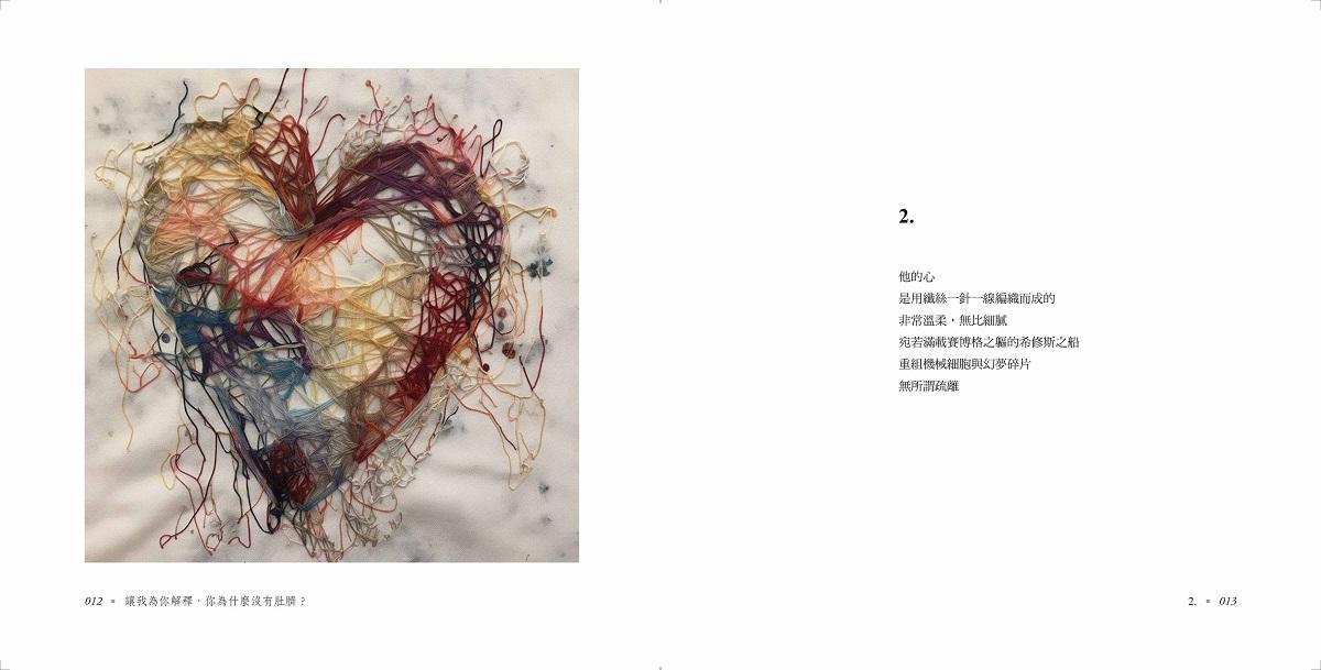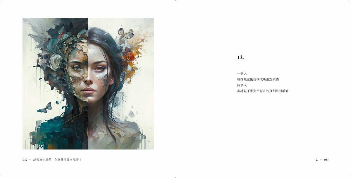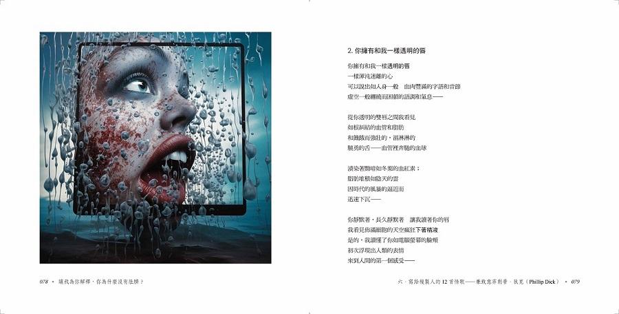 在我的青春時期,便已是陳克華的忠實追隨者與鐵粉。當時覺得他的風格很獨特,而年長後再讀,發現更能深入理解他的詩。除了讚歎,甚至還會感動到失聲痛哭。現在能為他作畫出圖,感覺十分榮幸;而能與他共同出版一本詩集,更是無比夢幻。去年,我有幸出版了全球華人第一本人類與AI圖文共創的詩集《失眠是一種漸進式》,這份成就讓我感覺彷彿得到了老天爺的眷顧。如今能持續創作與出版,更是幸運。當我翻開這本詩集的第一頁,那份真摯而強烈的感動油然而生,它不僅是我年輕時閱讀他詩作的延續,更是與當下AI時代的完美結合。這樣的具象呈現,甚至讓我自己都感到驚奇莫名。