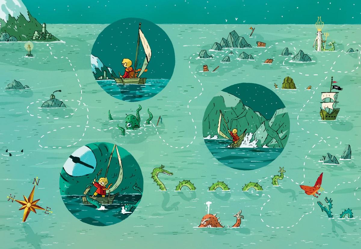 翻開《布朗家族的神話冒險》,看著布朗教授炫耀祖先們的冒險故事,心裡不禁讚嘆,這真是一個讓人羨慕的傳奇家族。布朗家族的故事成功吸引了我的目光,圖像功不可没。蝴蝶頁的插圖便傳遞了許多冒險旅程的訊息,令人忍不住停下來想像和探索。故事內頁插畫自然不做作的線條與協調的色彩,讓人百看不厭;尤其是圖書中角色大小反差的巧妙運用,更增添了奇幻的想像。