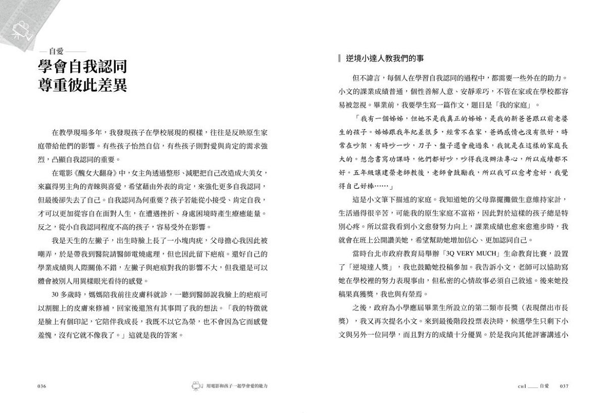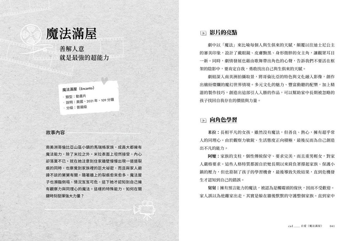 比起成人苦口婆心的說教,電影無疑是情感教育信手拈來的好工具、好導師,既能引發孩子學習的興趣,劇中角色與事件也是開啟討論話題的素材,還能引導孩子關注身邊類似劇中人的親友。倘若自己遇上了同樣問題,在電影類比經驗下也可思考並尋找解決問題的方向,從中獲得力量。