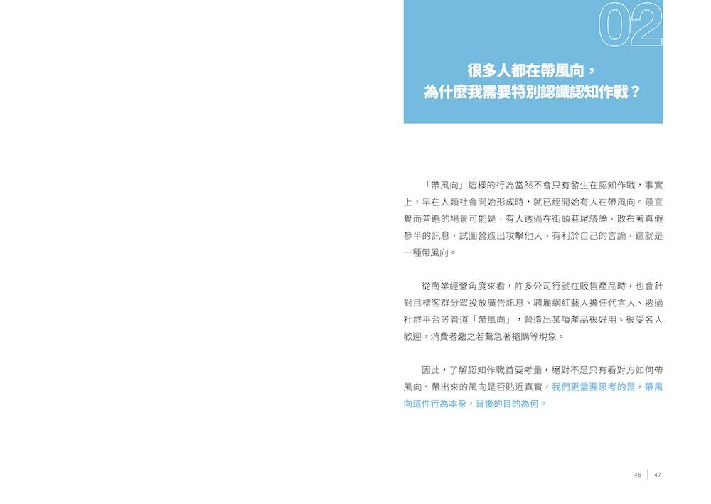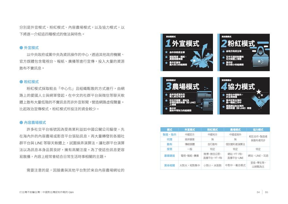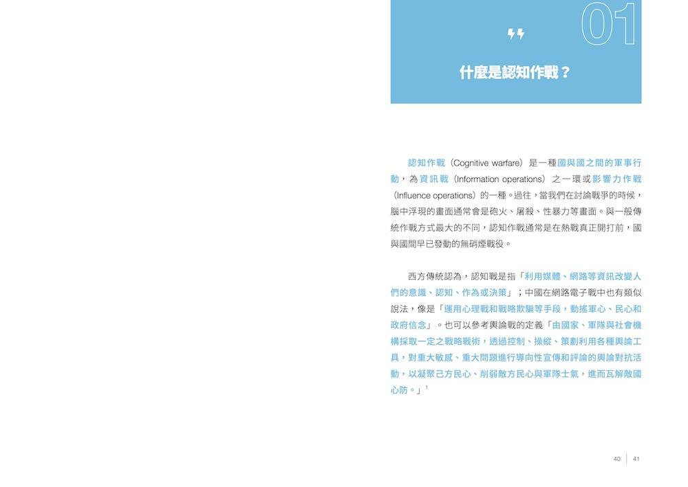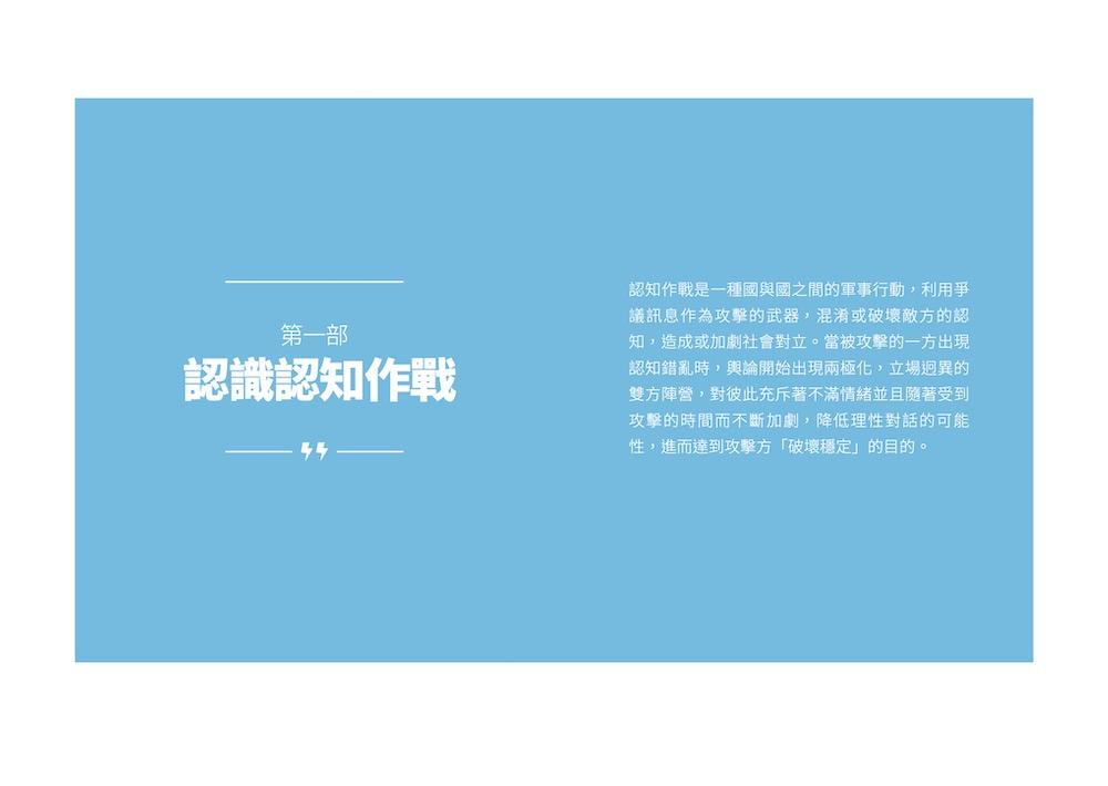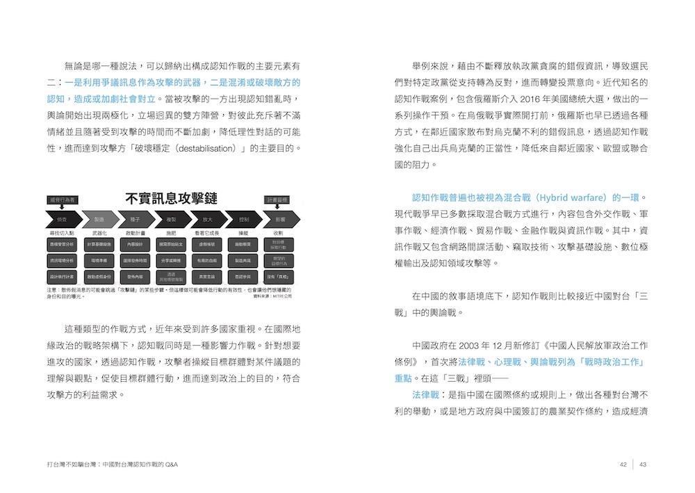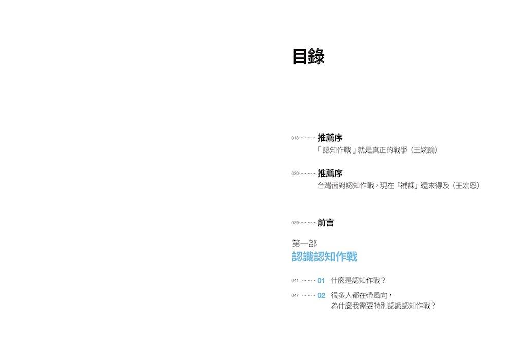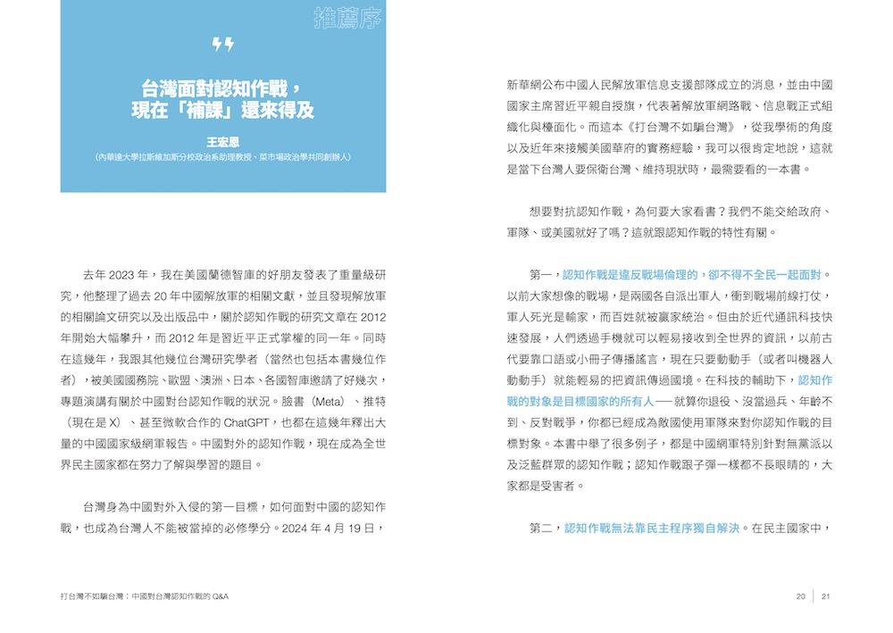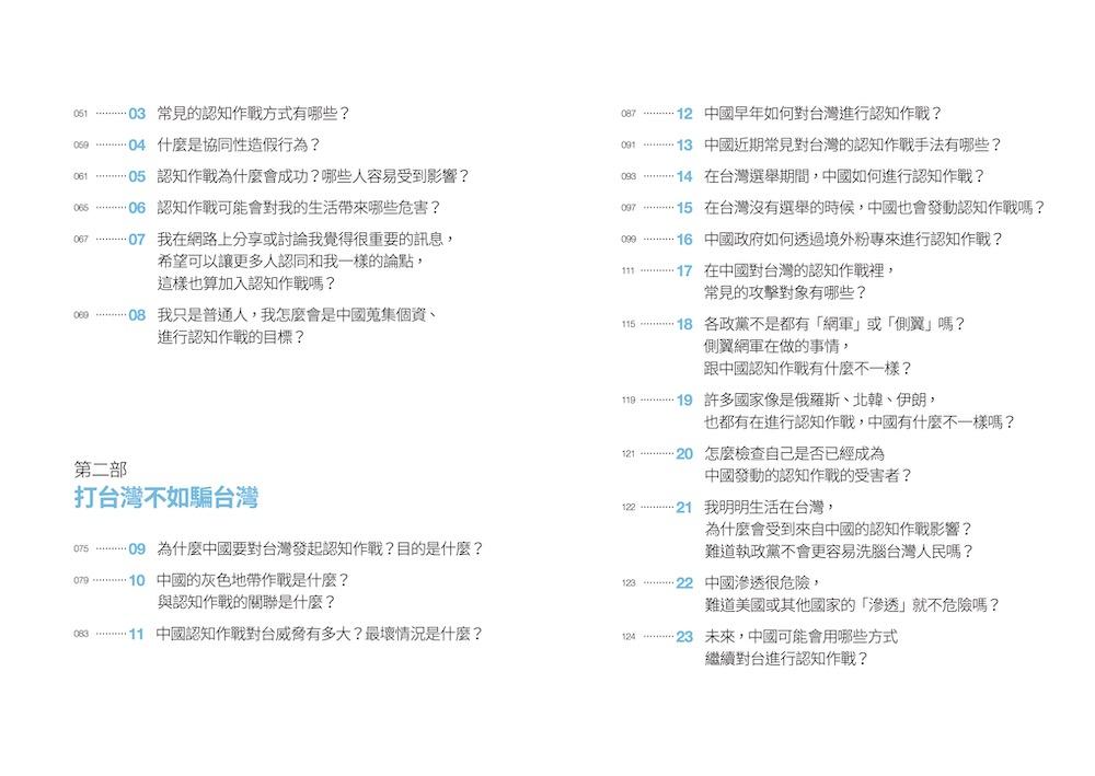 所以,如果你對於中國對台灣的「政治認知作戰」感興趣,這本書可以提供非常重要的基礎資訊;如果你認為談認知作戰只是一種「認知作戰的政治」,是用來打壓政敵、敵視中國的政治手段,你更應該打開這本書,裡面對於「為什麼要談認知作戰」、「為什麼境外認知作戰值得特別關注」,有非常持平而詳實的介紹,應該能夠協助你重新思考問題。其次,長期處在中國的文攻、武嚇、惠台、統戰攻勢當中,台灣人從早期鄧小平講個話台股就會大崩跌,到現在環台利劍軍演飛彈試射,沒人當一回事,台灣人處變不驚,把威脅視為常態的心理,固然是一種生存策略,但也是一種麻木不仁的危險。