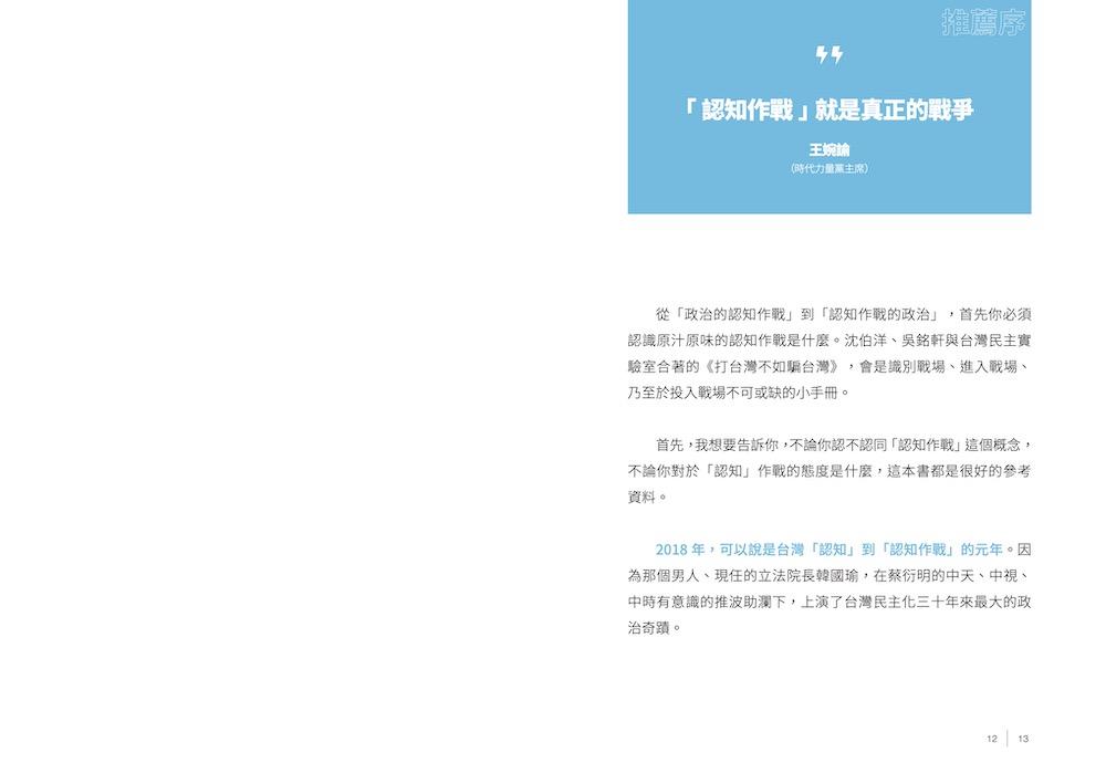 「台灣必須嚴肅的面對中國認知作戰的議題,在本地建立普遍的理解與紮實的實證研究,這本書不浮誇、腳踏實地,能夠協助有志者打開探照燈,直接開圖,定義戰場。」——王婉諭