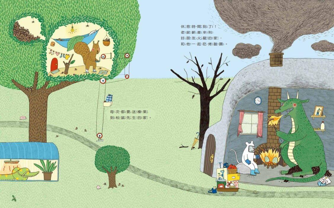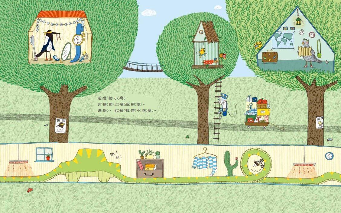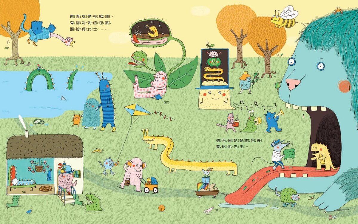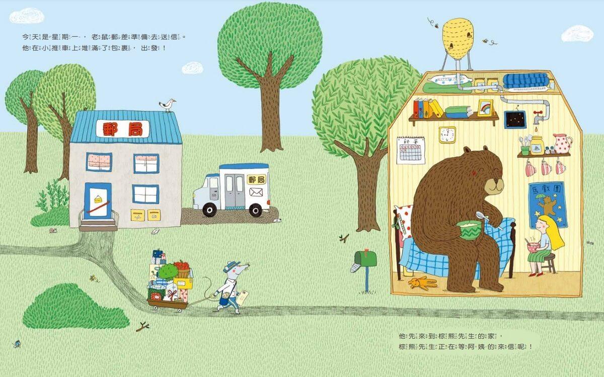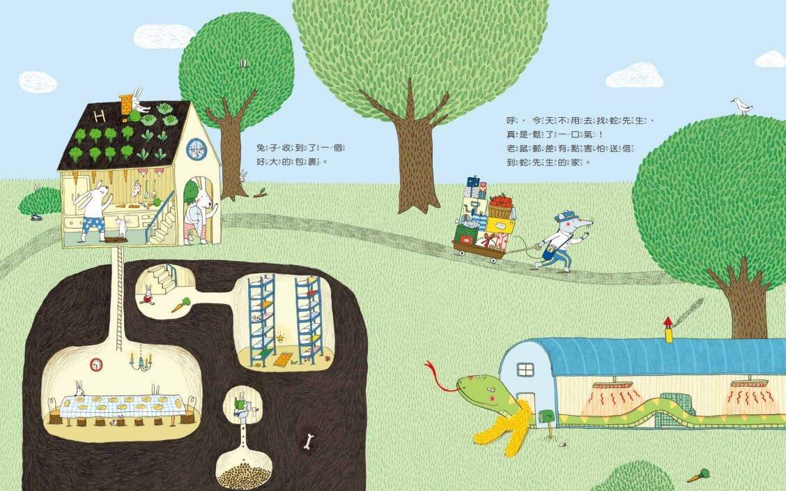 你會看到棕熊家的屋頂直接連著蜜蜂窩、蛇先生竟然吞了一輛汽車,找找看兔子家有幾隻小兔子、還有是誰偷跑進大野狼的家?仔細觀察老鼠郵差把每一件包裹送到誰家去?再猜猜看,最後一件包裹要送給誰?