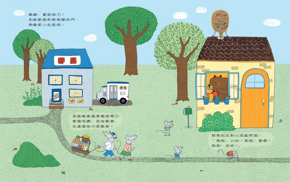 老鼠郵差把郵局關好門,帶著家人去度假。