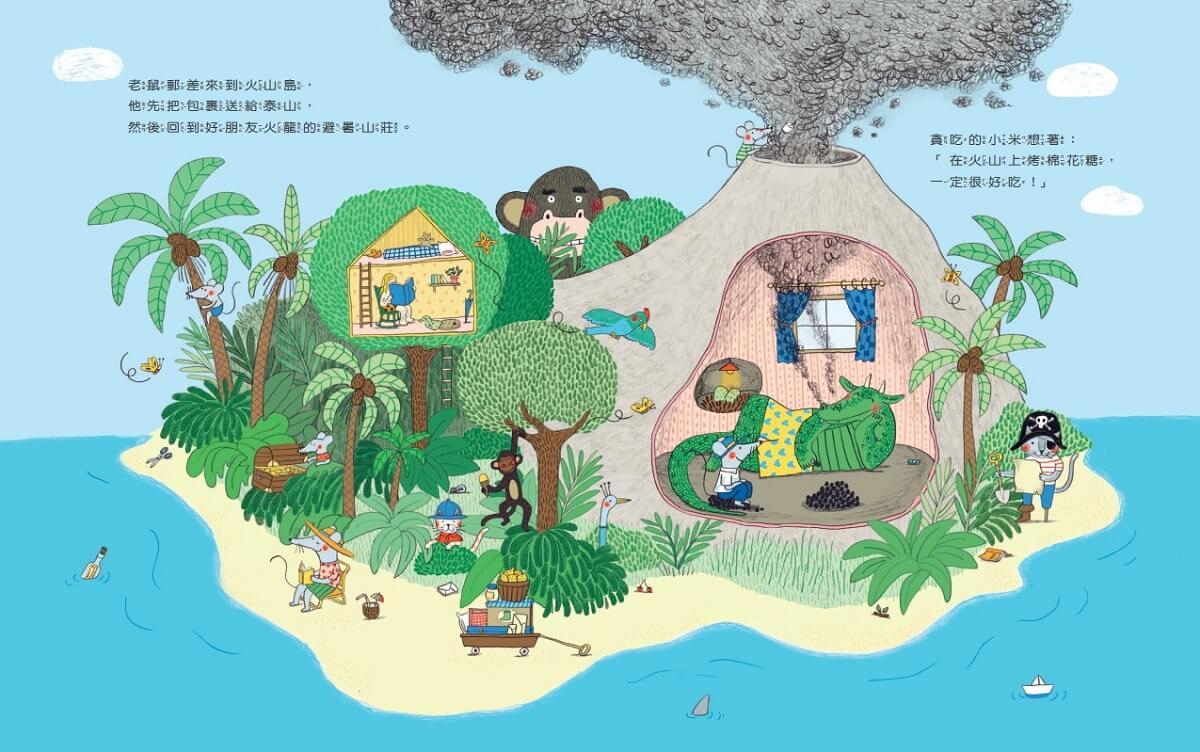 暑假到,老鼠郵差決定關上郵局大門,帶著全家五口出門度假。老鼠先生是位盡職的郵差,即使郵局不營業,他仍隨身攜帶包裹,旅行路上沿途親送。《老鼠郵差去度假》一書特色有四:首先,這是一本找找書,讀者依照文字提示,不僅能在畫面中找到對應的物件,還可發現文字隱而未言的許多幽默有趣小細節。此外,書中以12幅跨頁圖畫呈現老鼠郵差一家從森林到沙漠、海上到天空、城市到叢林、火山島到北極的行旅足跡,每個景點皆以滿版出血畫面呈現,視野開闊、豐富亮眼。第三,老鼠郵差一家不僅足跡遍布各地,使用的交通載具更是五花八門,除了搭郵輪、騎駱駝、乘坐熱氣球,甚至還將噴射器綁在身體沖上天、爬上野雁翅膀御風而行。第四,本書對於內部空間的描繪具想像與巧思。書中老鼠郵差每到一處,必會遞交信件或包裹給一位住在當地的收件人。圖畫書作家瑪麗安.杜布為了讓讀者看到這些住戶的室內陳設,仿效戲劇中三壁鏡框式舞臺的設計,將面向觀者的第四面牆打破,使室內陳設鉅細靡遺展現在讀者面前。整體而言,《老鼠郵差去度假》一書色彩溫暖明亮、筆觸和造型皆親和,是一本耐看好看的圖畫書。」——好書大家讀書評/劉鳳芯