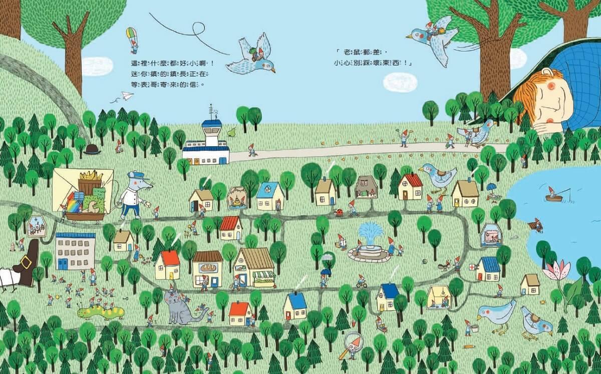 你會看到小熊軟糖在巧克力河裡划船、美人魚國度裡竟出現了小紅帽、迷你鎮居民的交通工具是毛毛蟲……請睜大眼睛,跟著老鼠郵差一起到想像國度去送信吧!