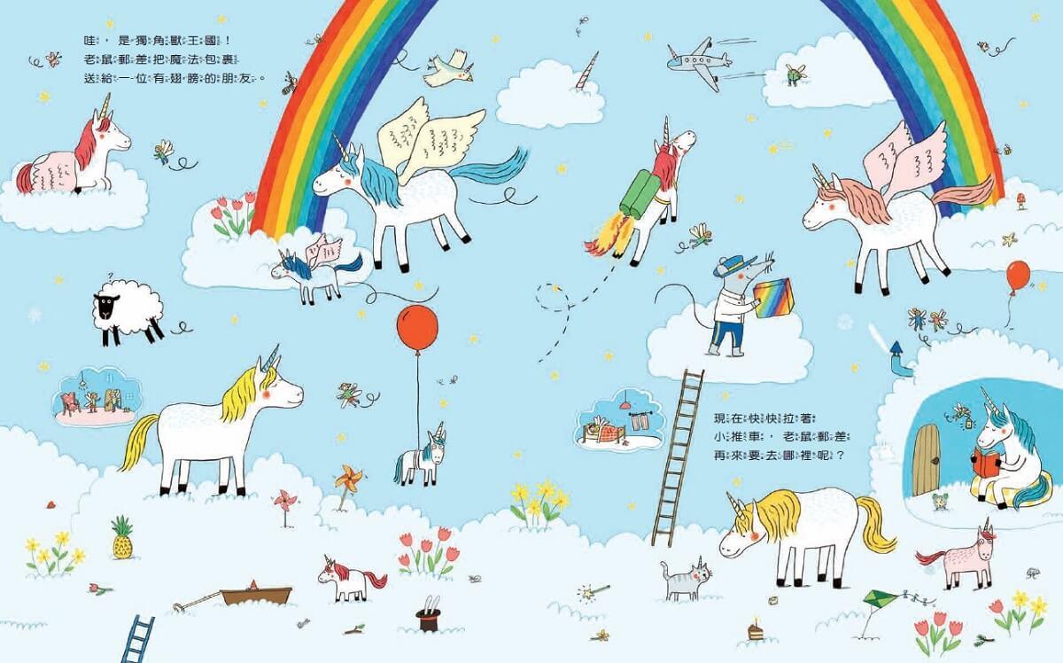 就像每天早上一樣,老鼠郵差為了送信早早起床,但這個早上,老鼠郵差不開郵務車,而是搭上了火箭……前往XYZ星球、糖果王國、迷你鎮和巨人鎮,從美人魚的家潛入海底兩萬哩,接著來到怪獸國、機器人工廠、上下顛倒國,再飛到朵朵白雲上的獨角獸王國,當老鼠郵差送包裹時,什麼也擋不住他!