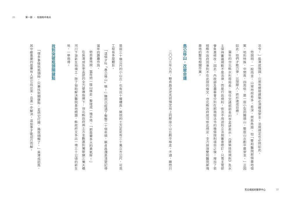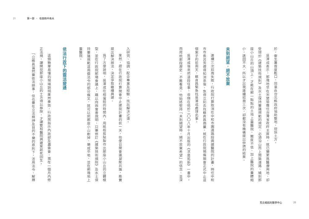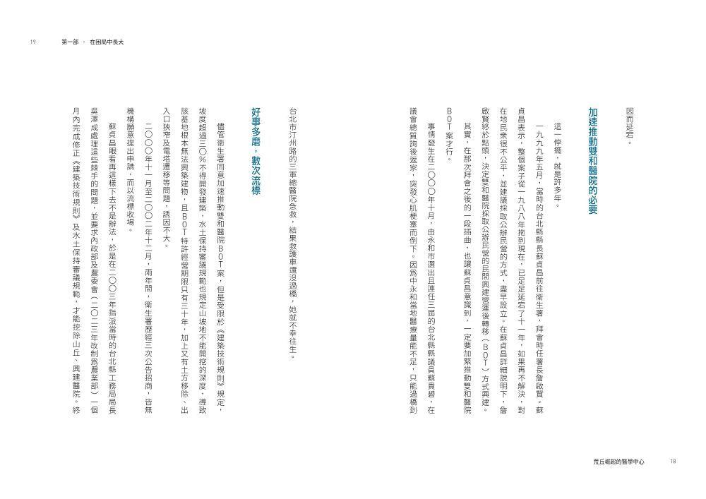 面對一片荒煙蔓草,開始建設前必須先做一回「愚公移山」的工作。問題是,地面下埋藏的種種,地面上的土方、山坡地開墾的法規與水土保持要求……為了克服這許許多多的挑戰,這場從1988年開始規劃的BOT案,歷經三位台灣省主席及精省後的省長,以及五任衛生署署長,長達十五年時間,終於塵埃落定。