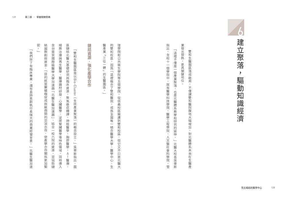 雙和生醫園區落成啟用,讓雙和醫院的腹地增大;再加上,結合一校六院的資源,並協助鏈結國際創投資金,讓產、學合作更為緊密。尤其,北醫體系深切了解,醫學大學的老師除了傳授知識,更要創造知識,並讓這些知識產生價值,成為知識經濟,再把從中獲得的利潤回饋到基礎研究及臨床醫療,創造更多新的知識。