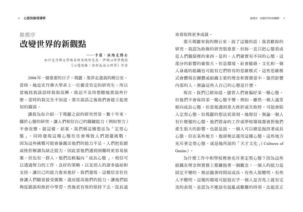 「《心態致勝領導學》提醒我們,能力並非一成不變。這本書是一個很好的起點,讓我們思考何時以及如何採用不同的心態。」──《華爾街日報》