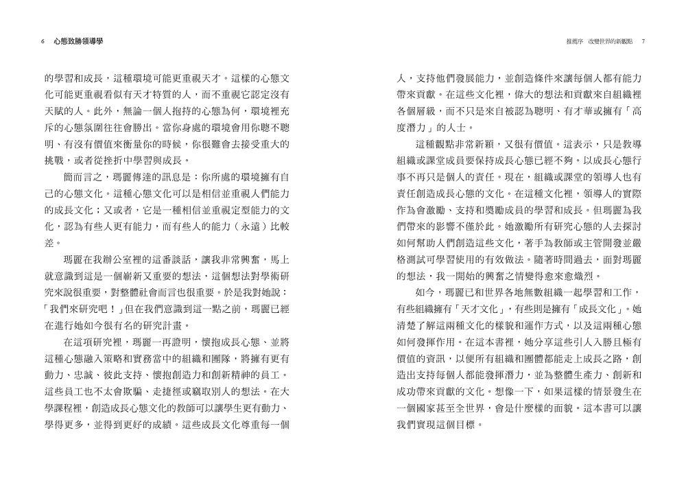 但到底什麼是成長心態的文化?它真正的展望是什麼?在實務中,成長心態會是什麼樣子?以及朝這種文化發展代表什麼?我將在本書一一說明。此外,我還會說明成長心態文化不僅適用於大公司,也可以提升學校、非營利組織、體育團隊的表現⋯⋯基本上只要是兩個人以上一起工作的環境,它就可以發揮作用。我們還將探討研究個人心態的最新科學發展,以及這些科學發展如何和我們已知的心態文化有所交集。